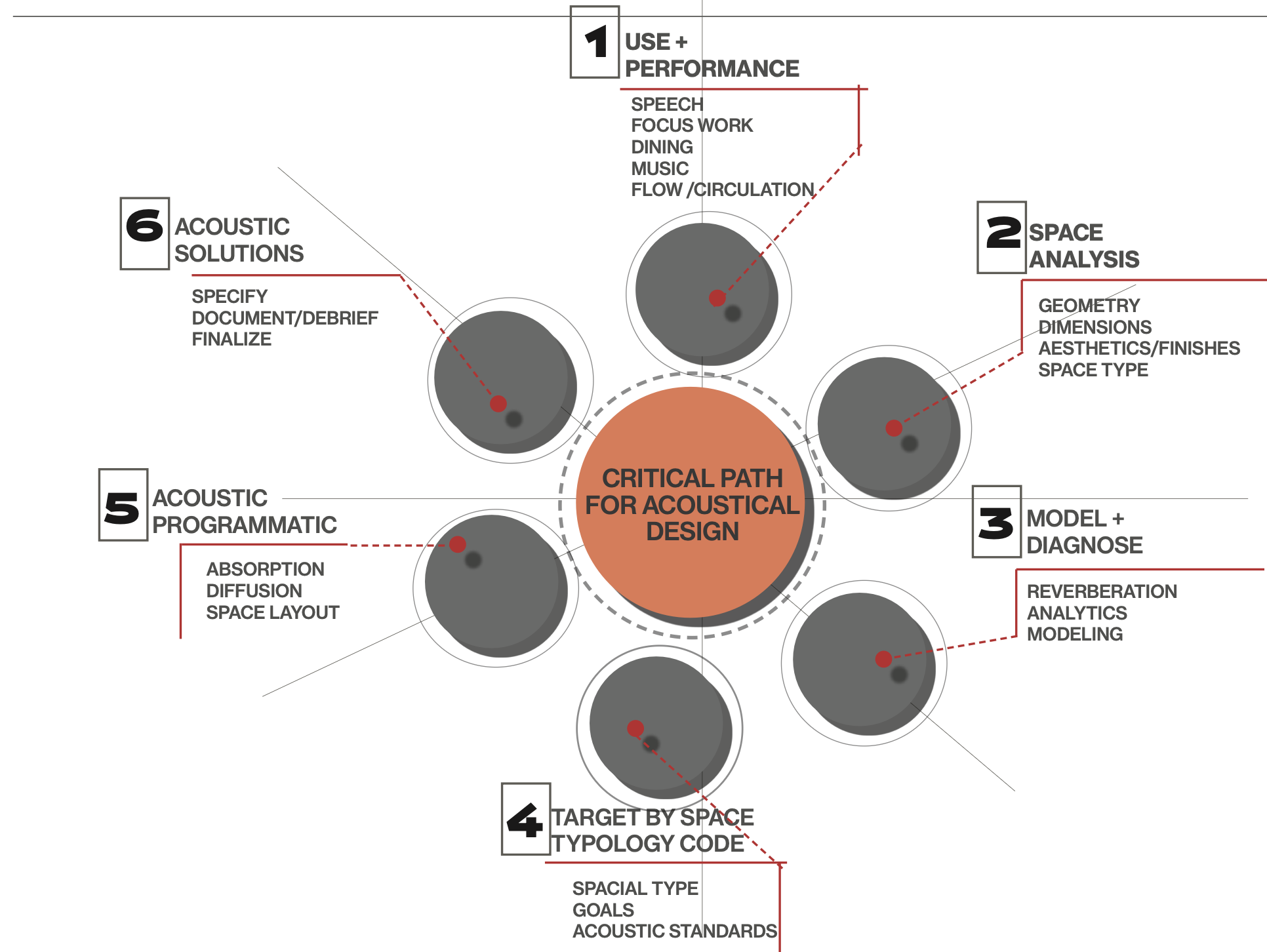 Illustration of Core Variables in Commercial Spaces Acoustic Behavior + Acoustics Analysis Process by CSI Creative