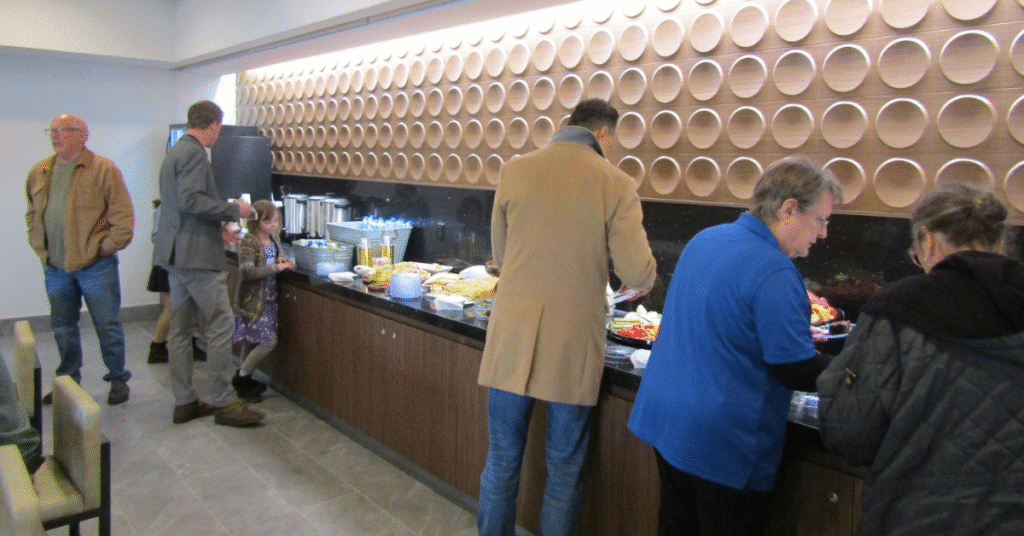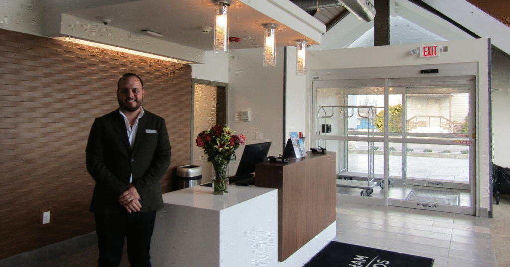 The Geneva location highlights this approach beautifully. The reception area features a dimensional wood look wall installation that brings depth, sculpted texture, and a welcoming focal point as guests enter. The lighting enhances the natural grain effect, and paired with the vaulted ceilings and exposed ductwork, the result is a clean, contemporary lobby that reinforces a unified brand atmosphere.