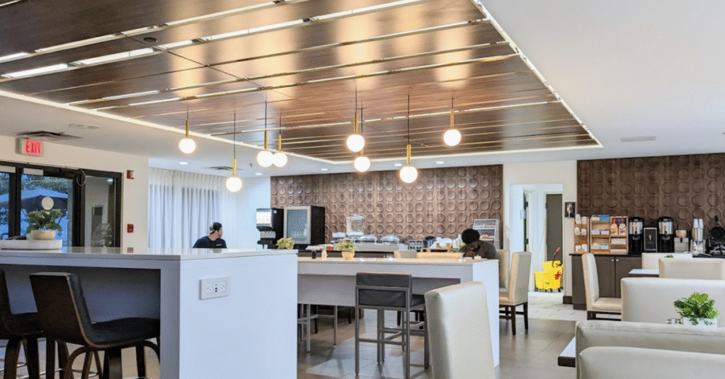 Hospitality is about creating a brand, and creating a brand is about uniformity in design and aesthetic. Wingate hotels continue to strengthen that identity by incorporating wall panels by us with a wood look—aesthetics that deliver warmth, texture, and long-term durability while staying visually consistent across multiple properties.
