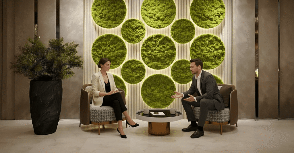 In office environments, plant wall art is often installed within reception areas, meeting spaces, and circulation zones. The installations function as decorative wall features integrated into interior architecture.