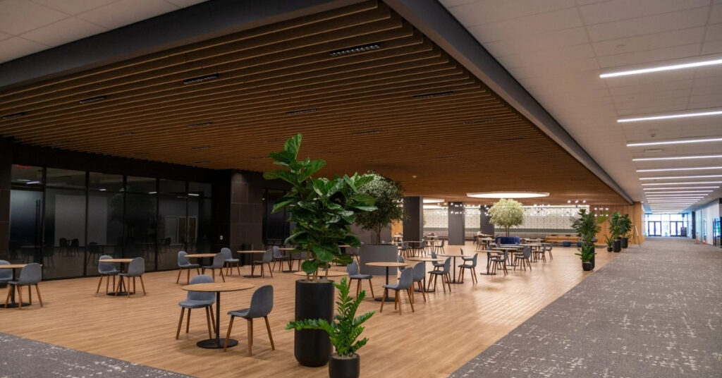 Compared to authentic wood millwork, WoodLite™ delivers a rich timber aesthetic with significantly lower material and labor costs. That cost-efficiency made it possible to invest more in amenity-rich features throughout HQ Plaza’s newly activated concourse.