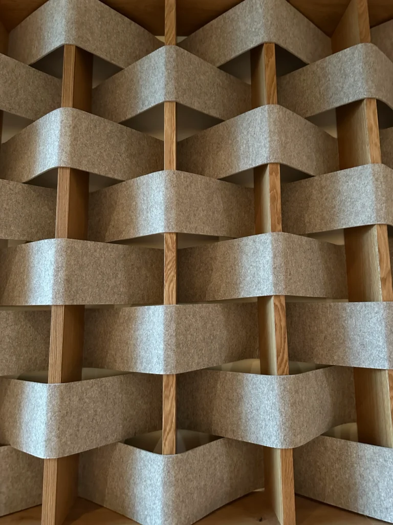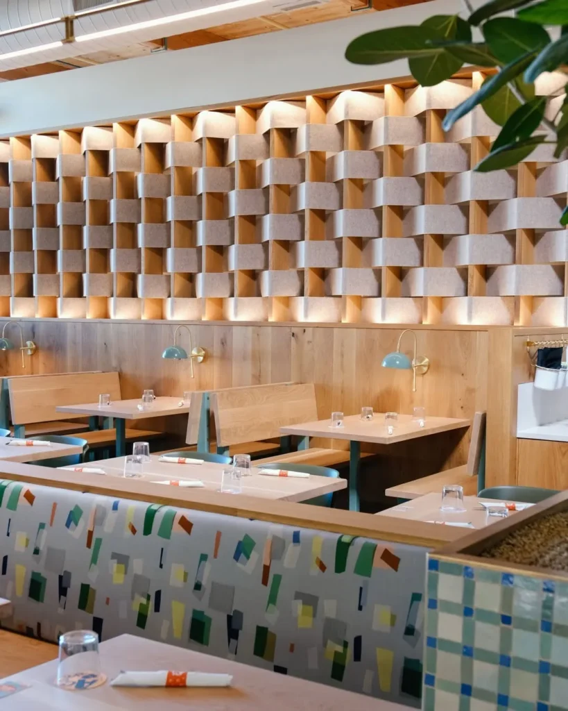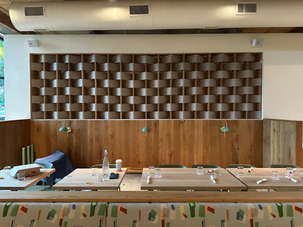 A custom wool felt feature wall at Acorn Cafe blends softness and structure, weaving warm tones and acoustic performance into a welcoming dining environment.