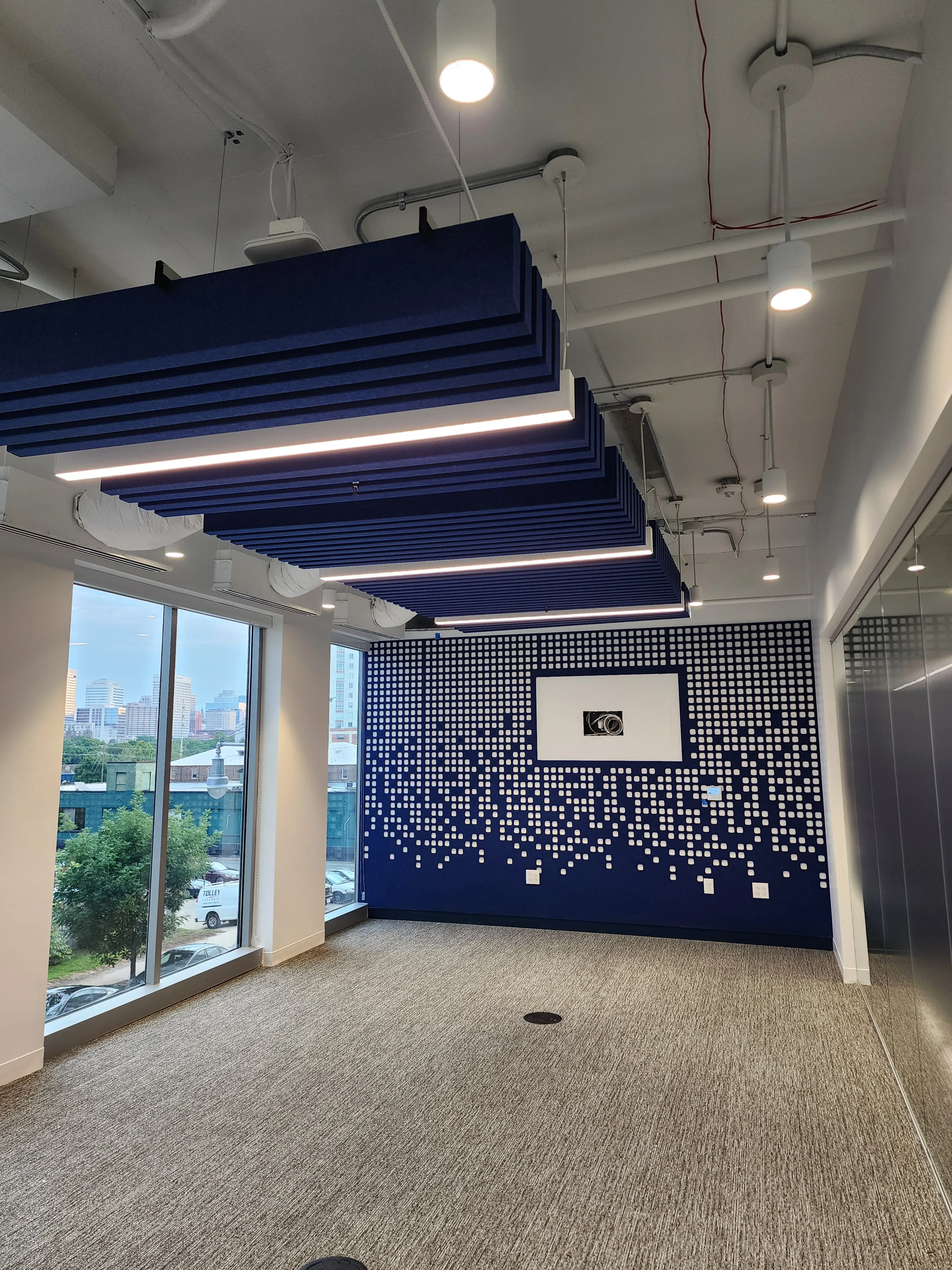 Direct attached dividers and baffles reduce echoes and add a touch of branding to this AON office.