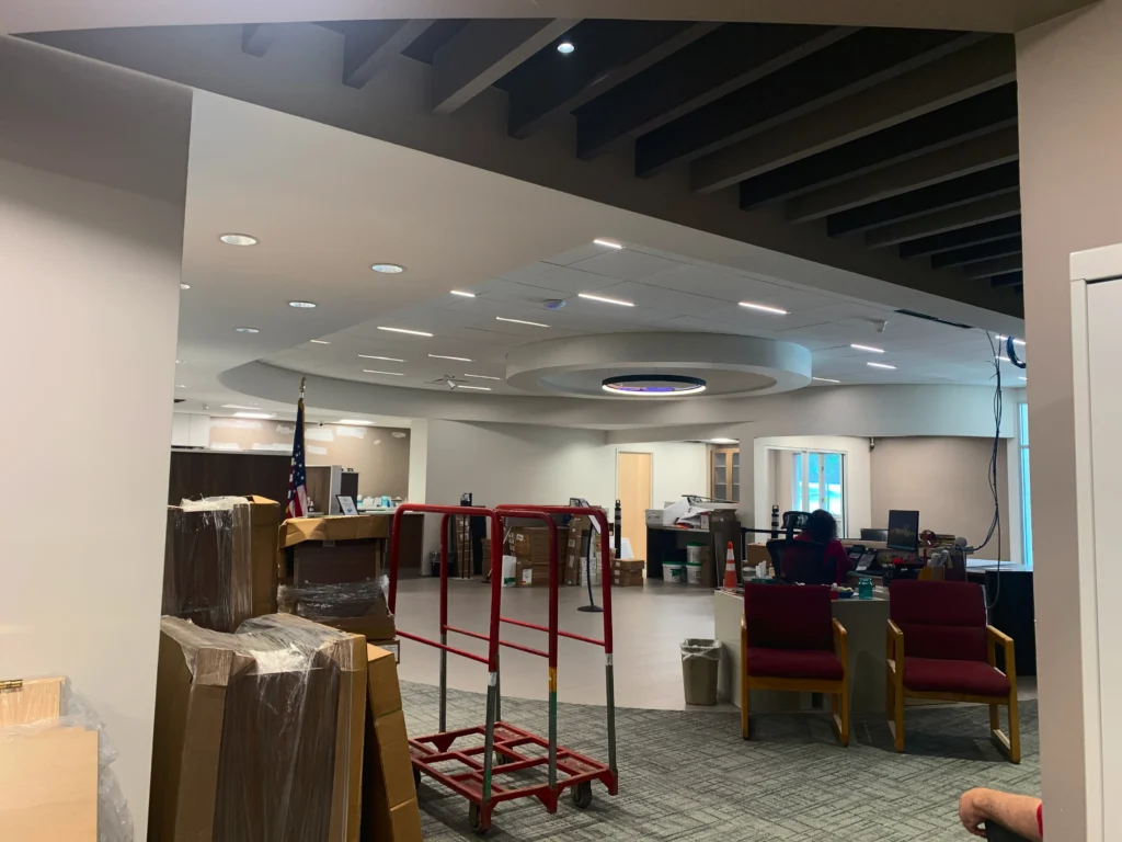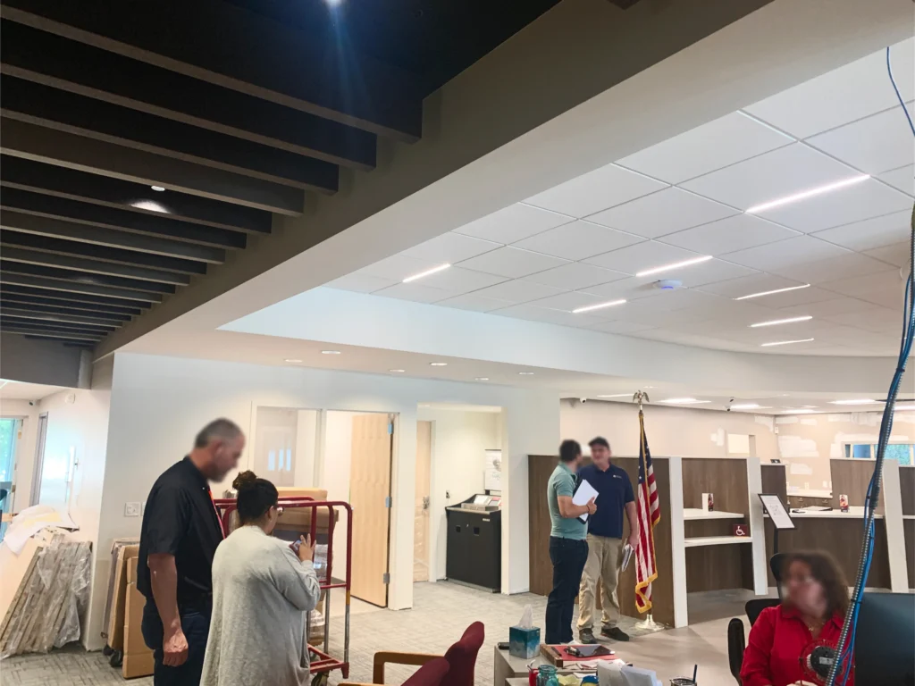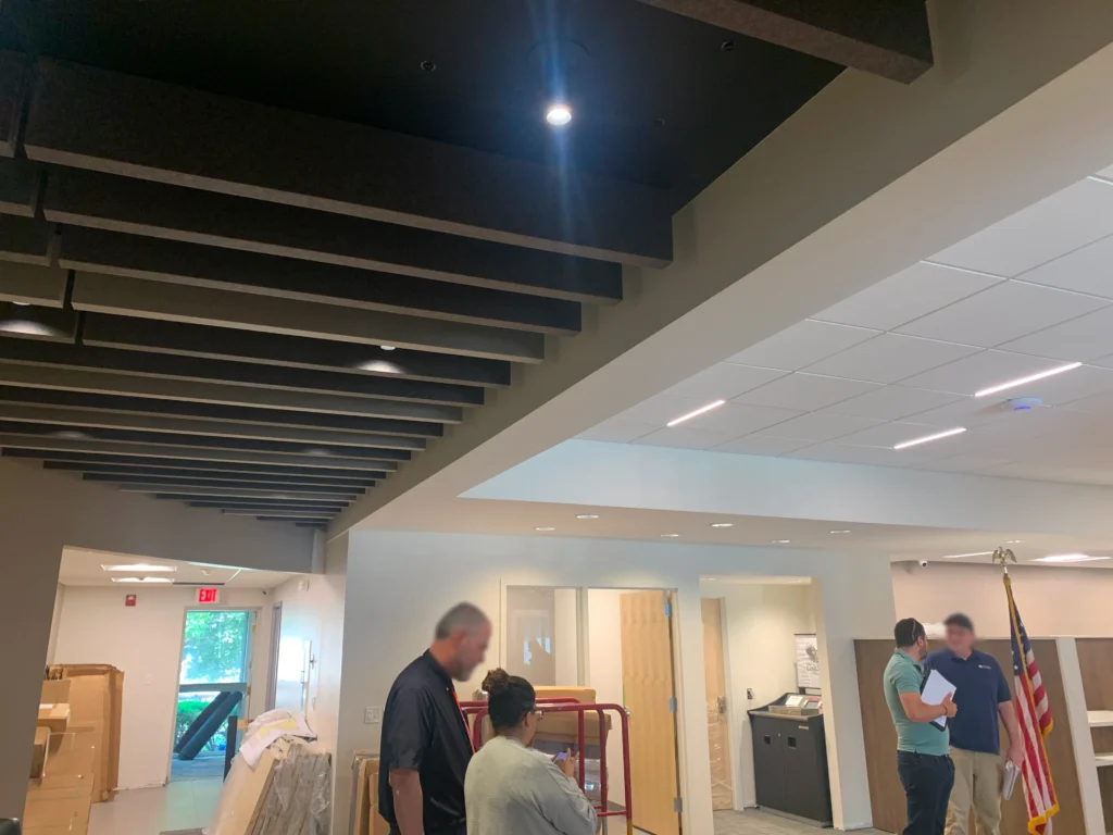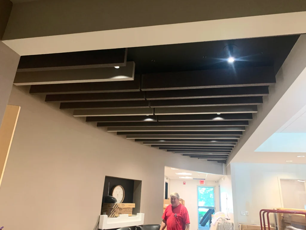 Folded acoustic baffles add clean lines and controlled sound to Central Maine Federal Credit Union’s interior, enhancing both comfort and modern design.