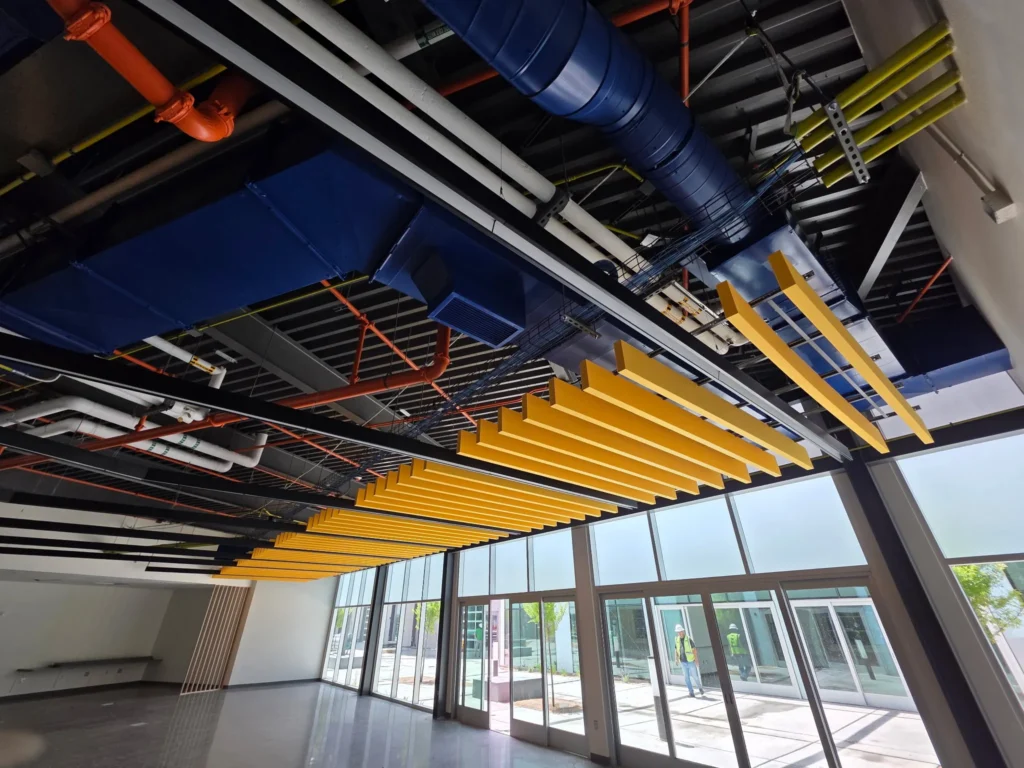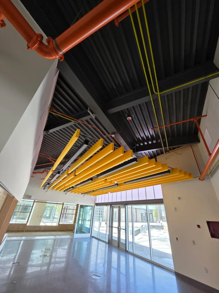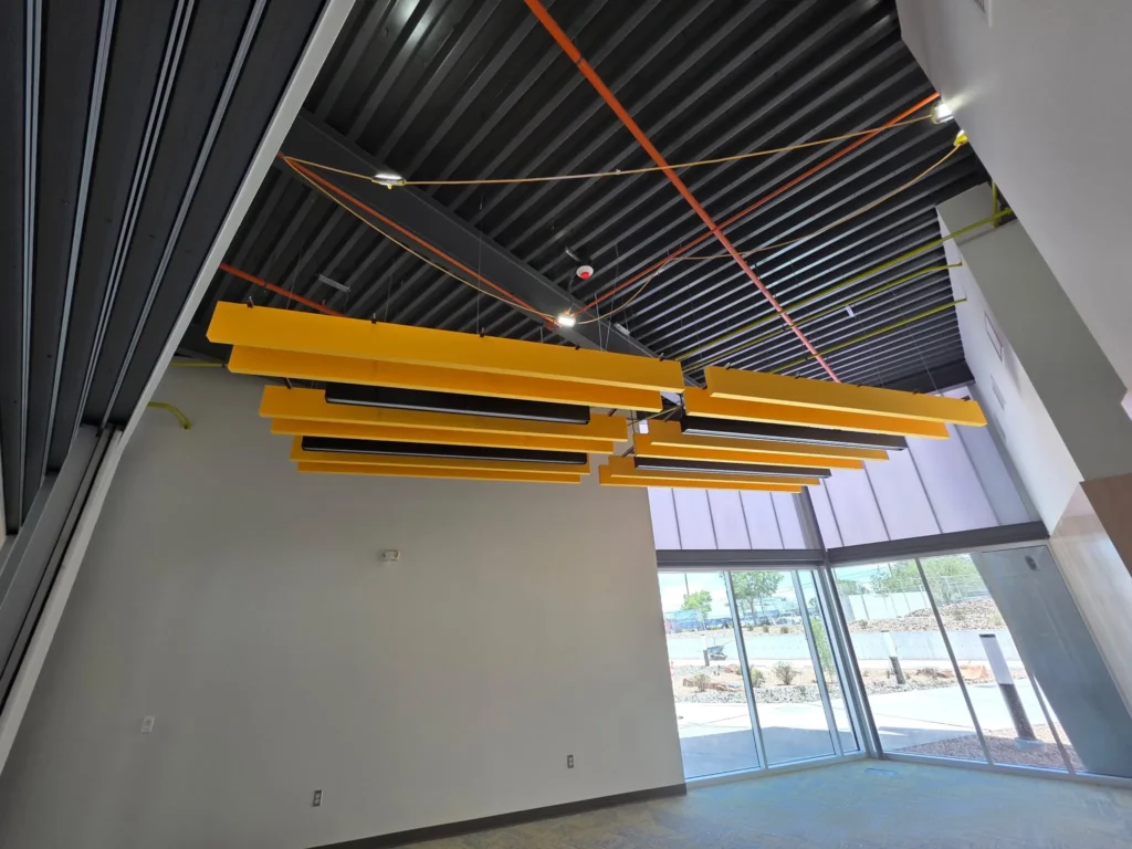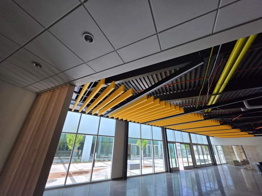 Vibrant yellow baffles bring bold contrast and sound control to Central New Mexico Community College’s Montoya Campus.