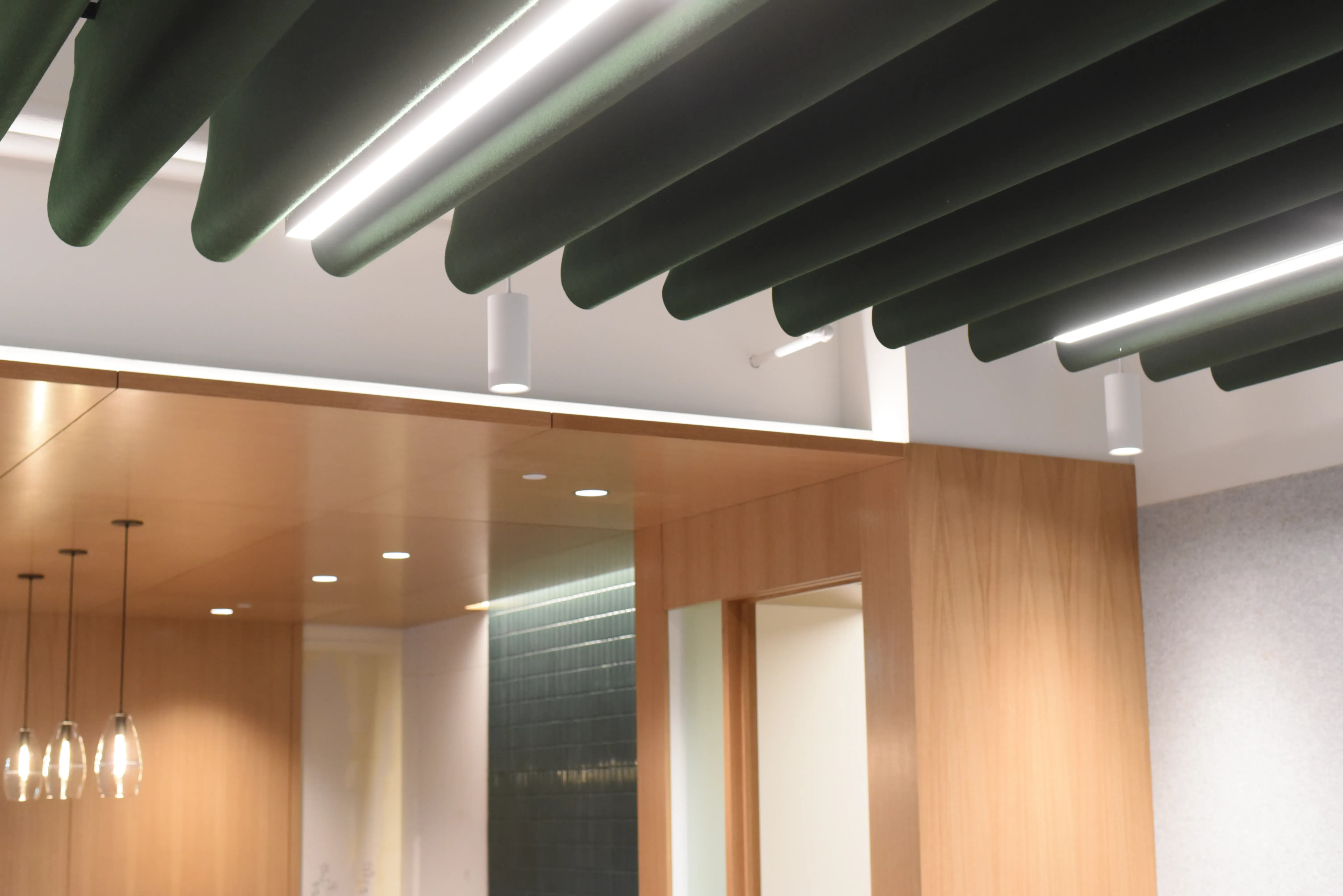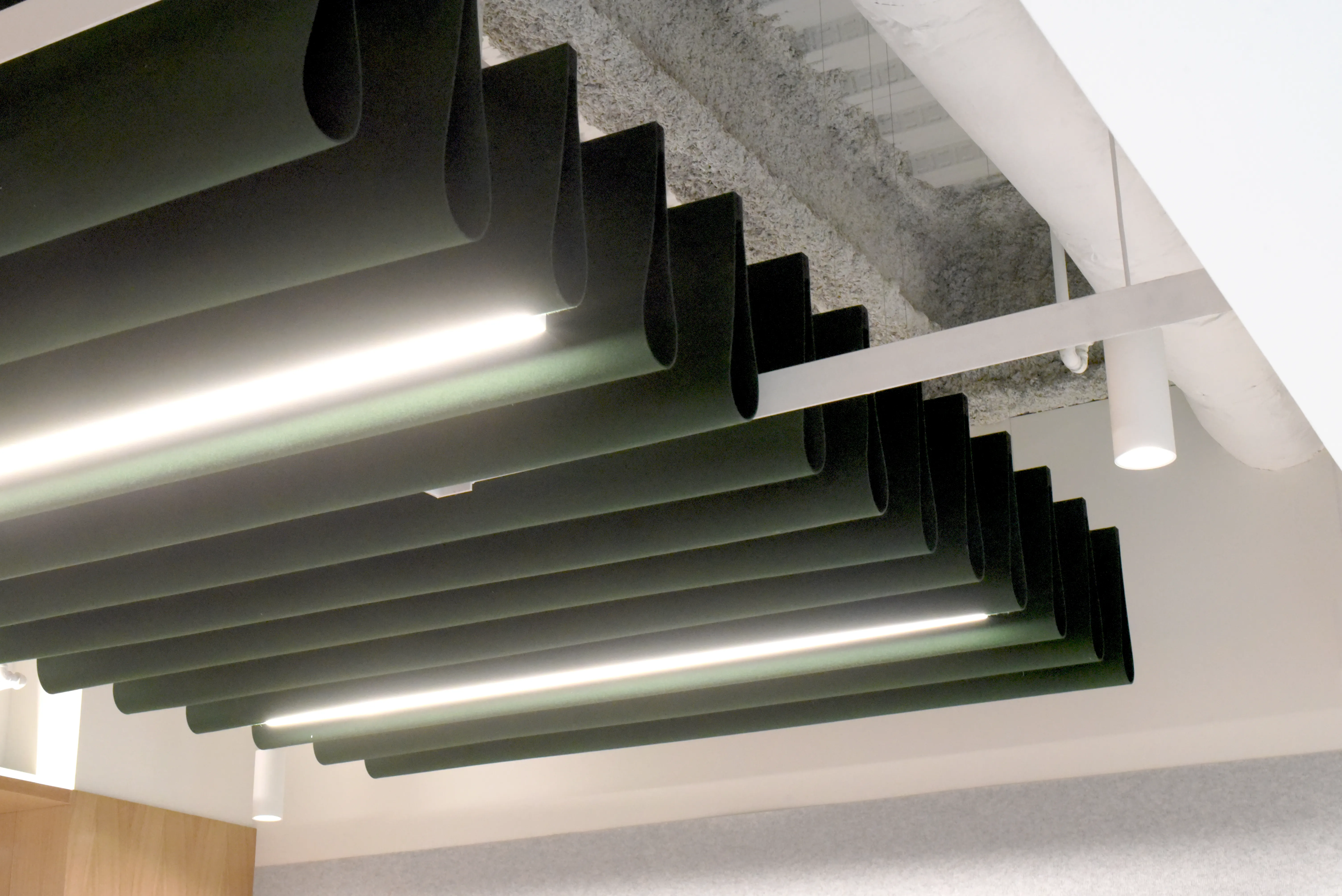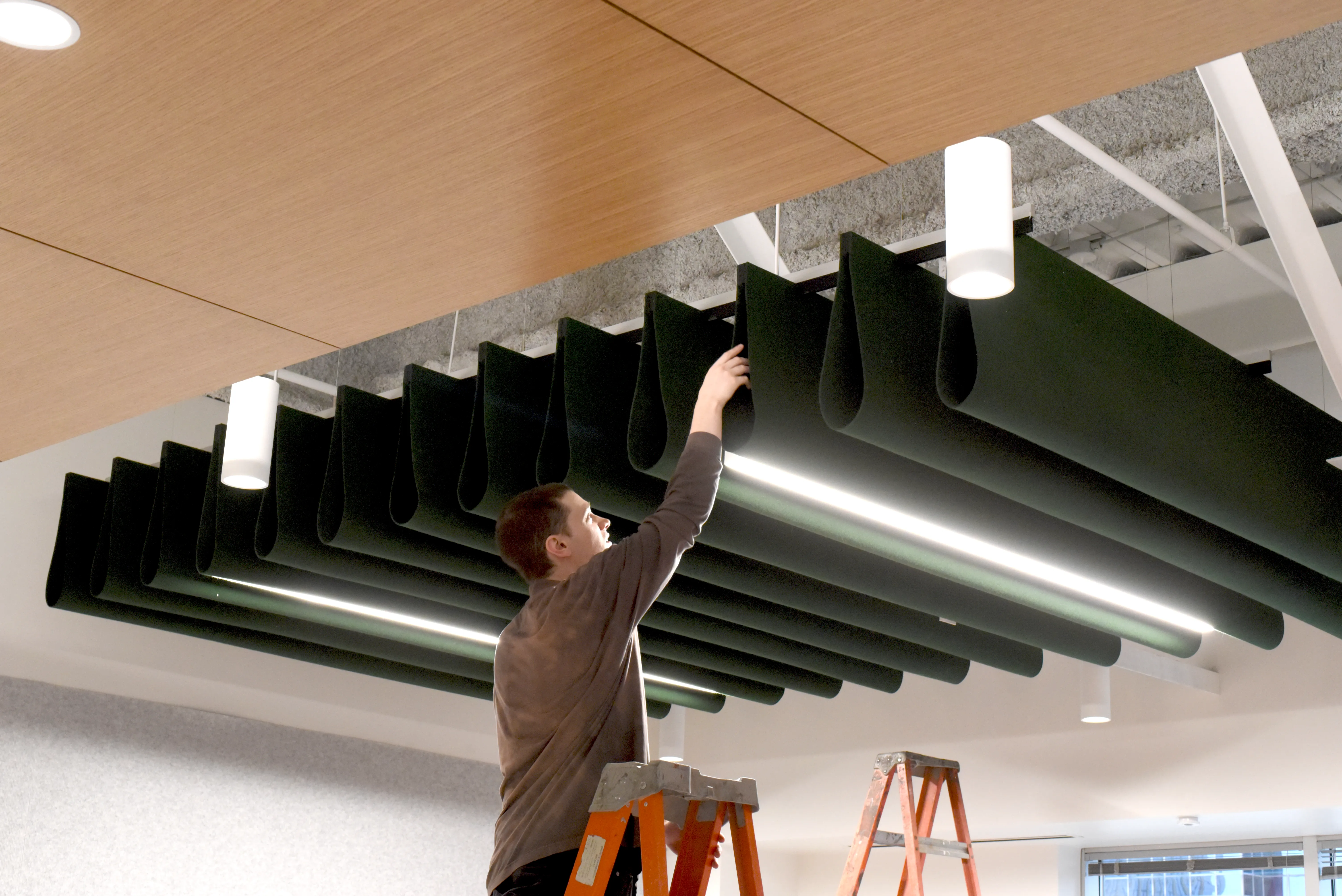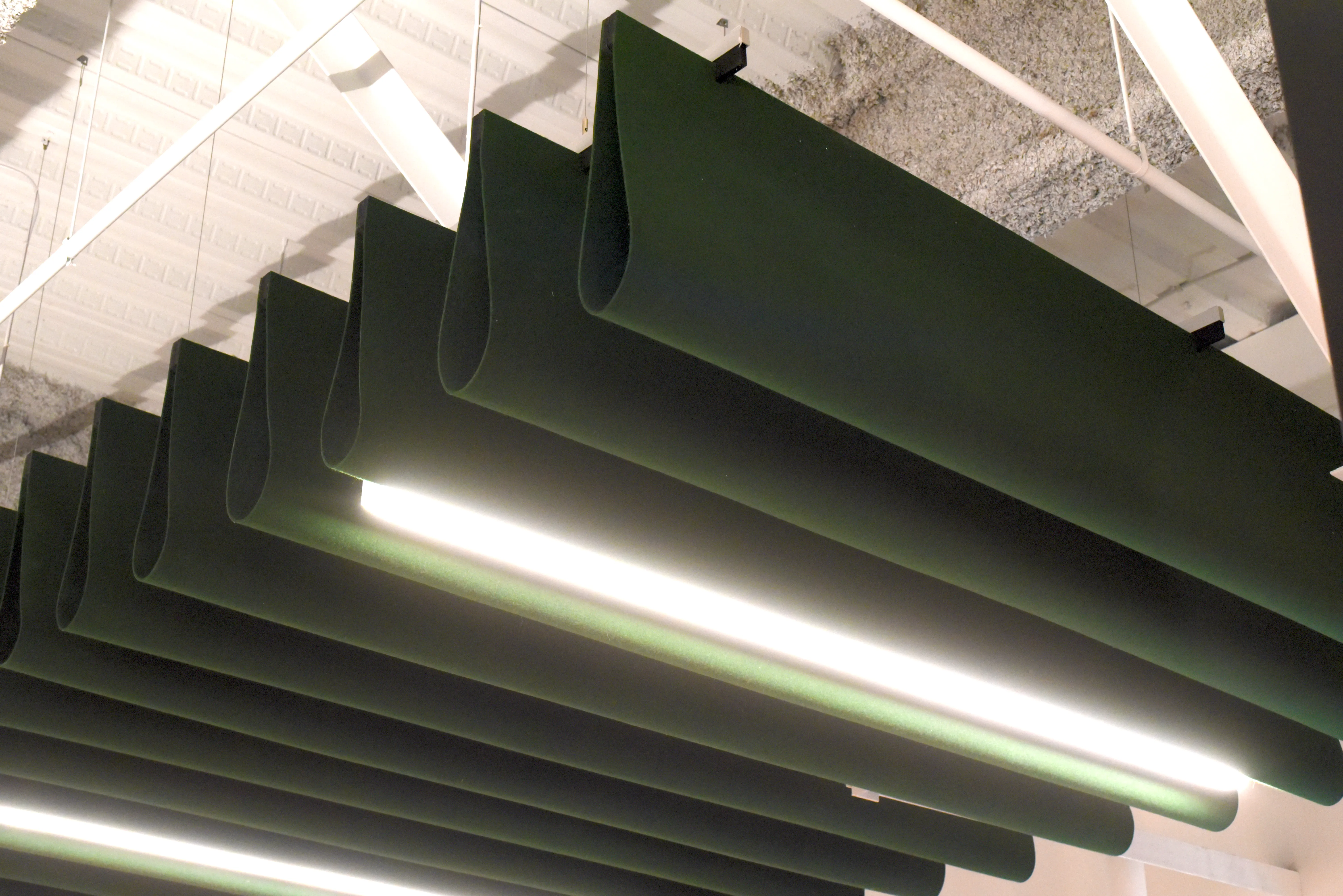 Draped wool felt baffles add a soft and luxurious touch overhead for our Minneapolis neighbors.