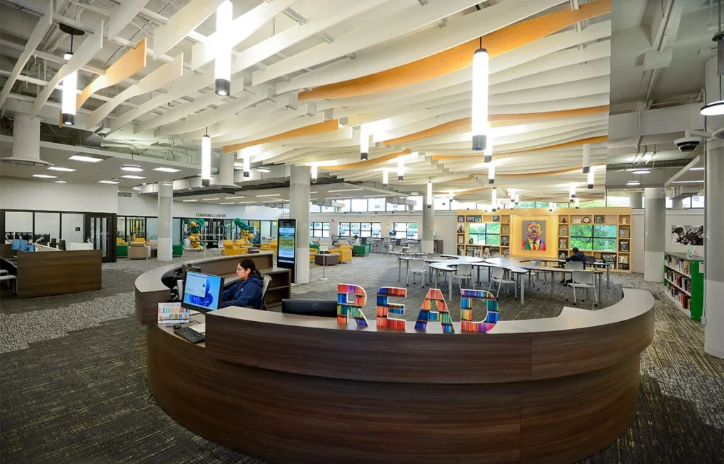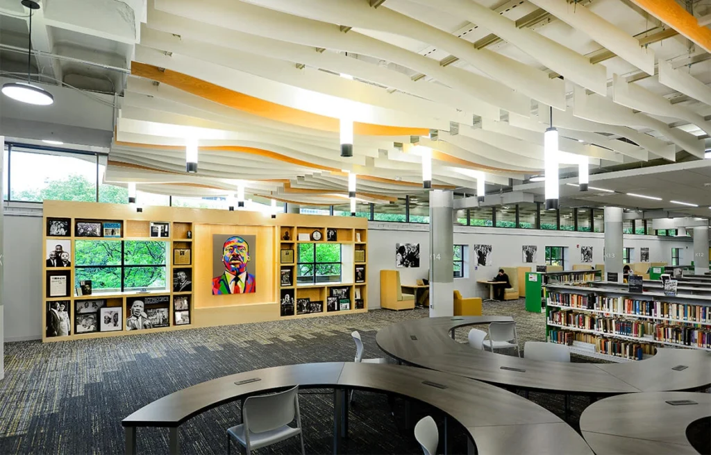 Essex County College Library & Learning CenterBy Sanjay Roy / May 22, 2025 Back to Projects Essex County College Library & Learning Center Custom baffles at Essex County College blend wood textures with white fins to add warmth, movement, and acoustic comfort to the library’s central hub. LocationNewark, New JerseyDesignerDMR Architects