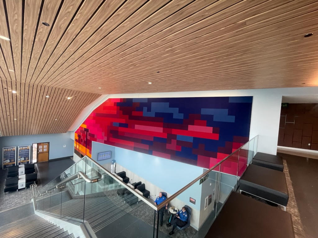 Custom wall tile configurations depict a sunrise and sunset in a colorful mosaic pattern, acting as a stunning focal point for the new terminal at Garden City Regional Airport
