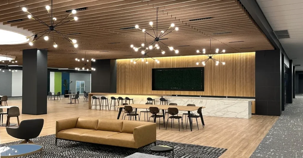 Elegant wood-grain acoustic baffle ceilings enhance HQ Plaza Morristown’s warm, contemporary lobby and elevate the space’s immersive, destination-style design.