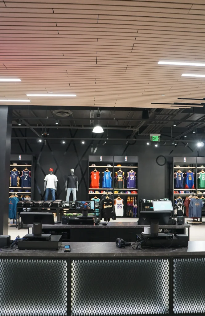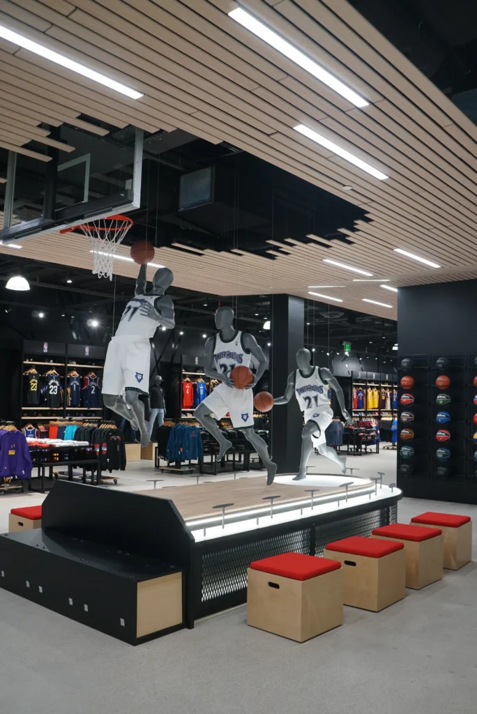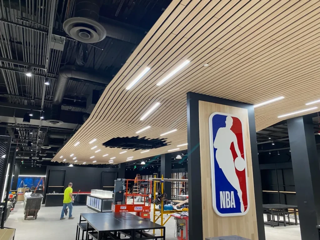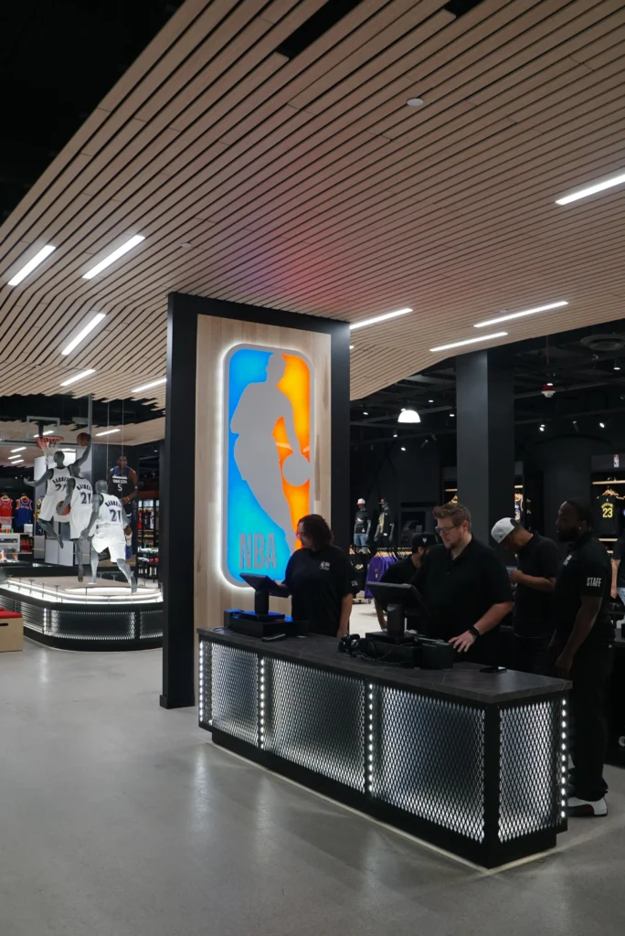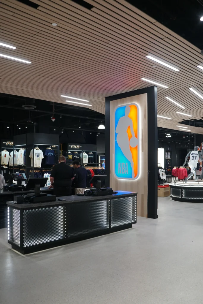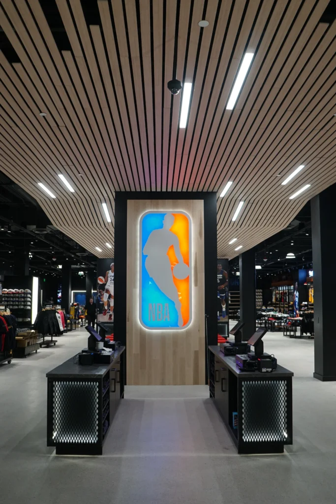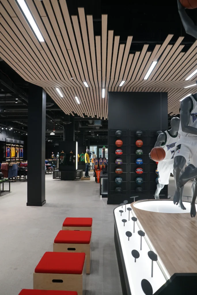 Custom wood-textured ceiling planks with integrated lighting bring warmth, rhythm, and acoustic control to the Lids x NBA Store at Mall of America.
