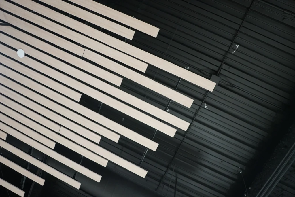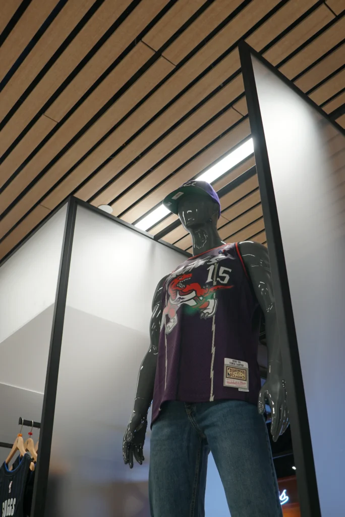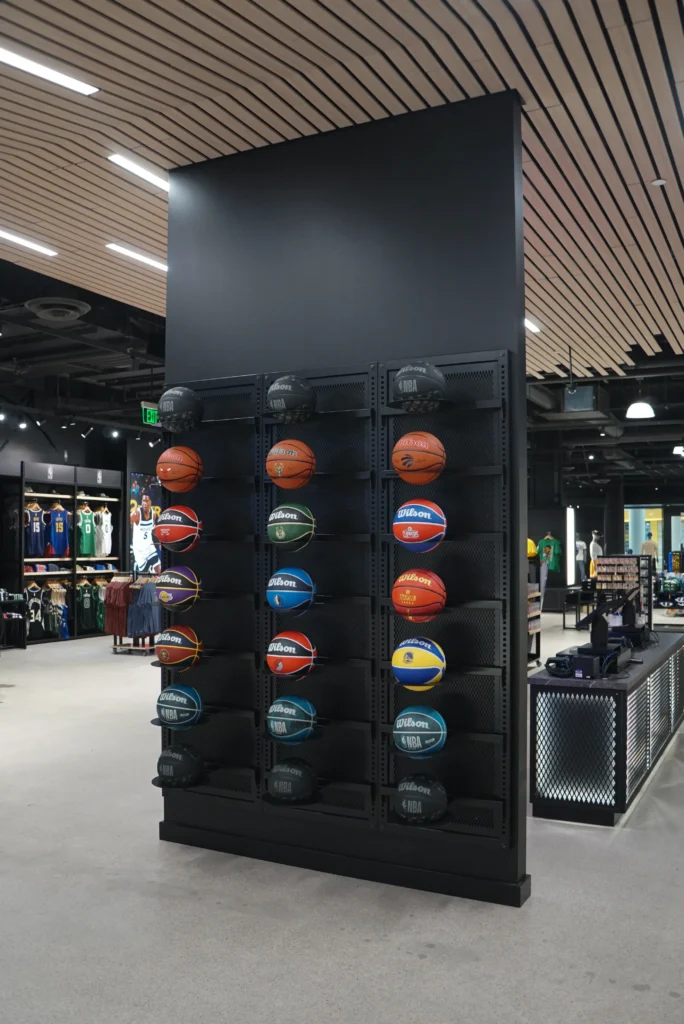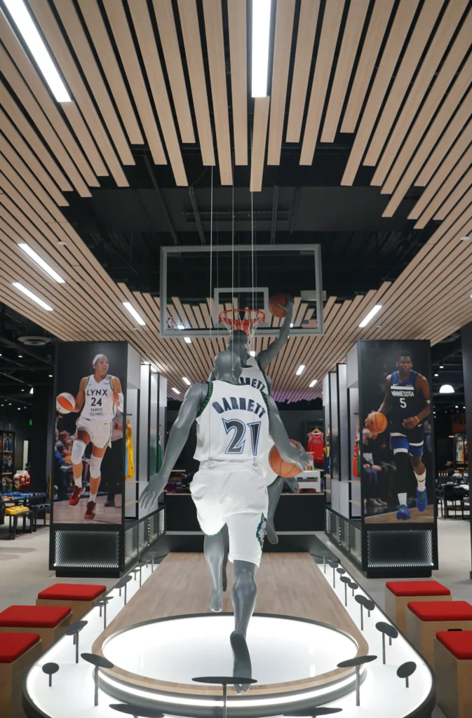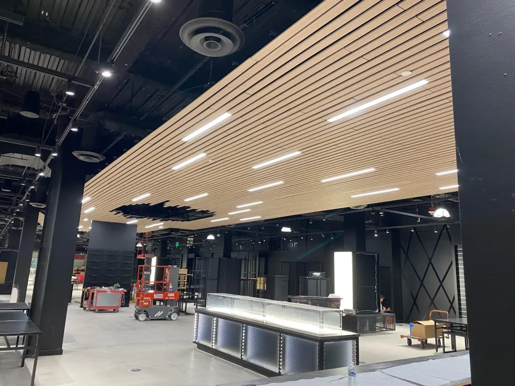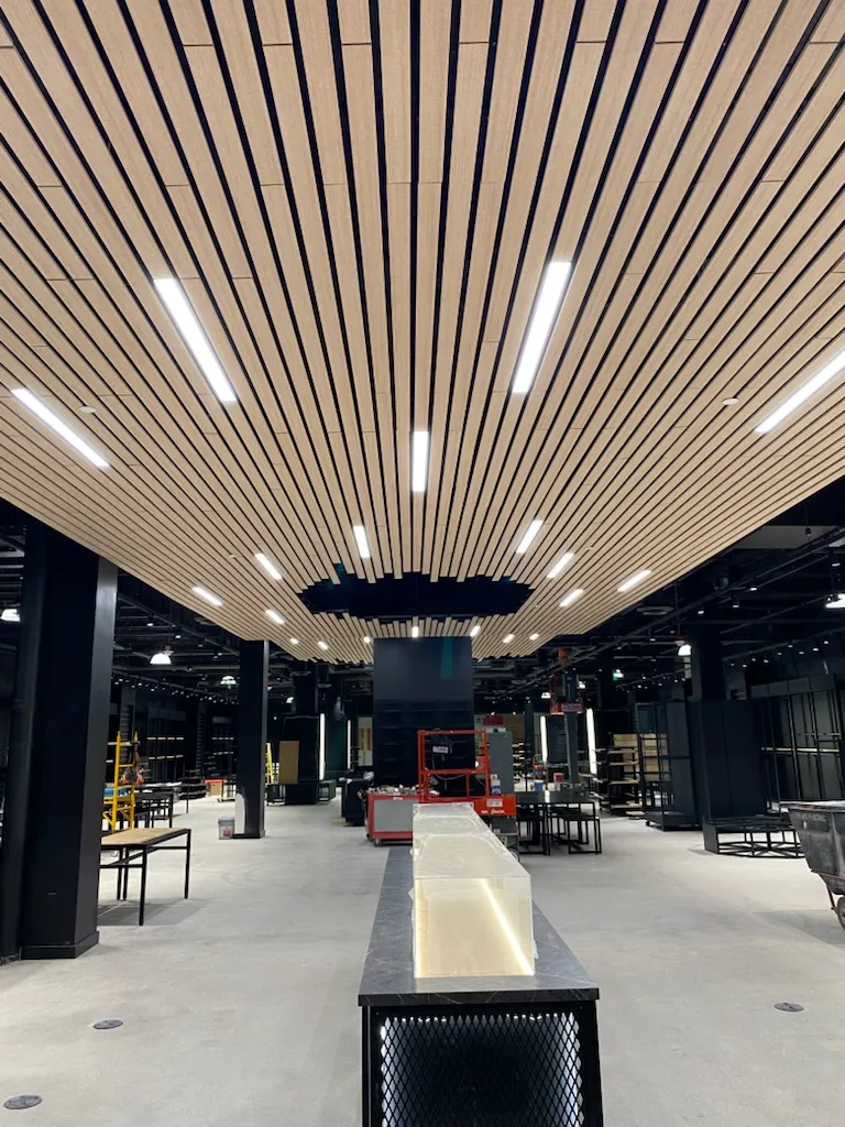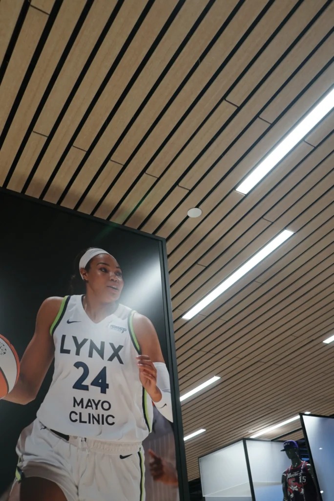 Custom wood-textured ceiling planks with integrated lighting bring warmth, rhythm, and acoustic control to the Lids x NBA Store at Mall of America.