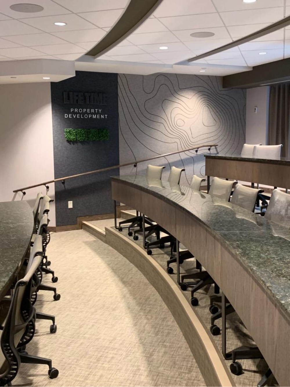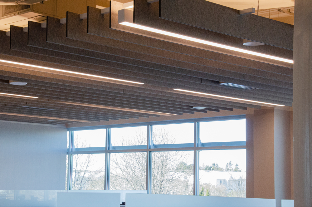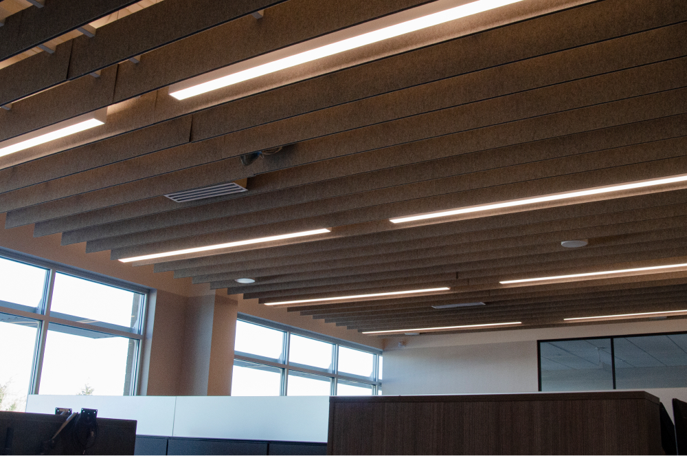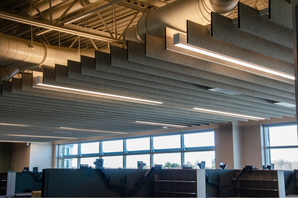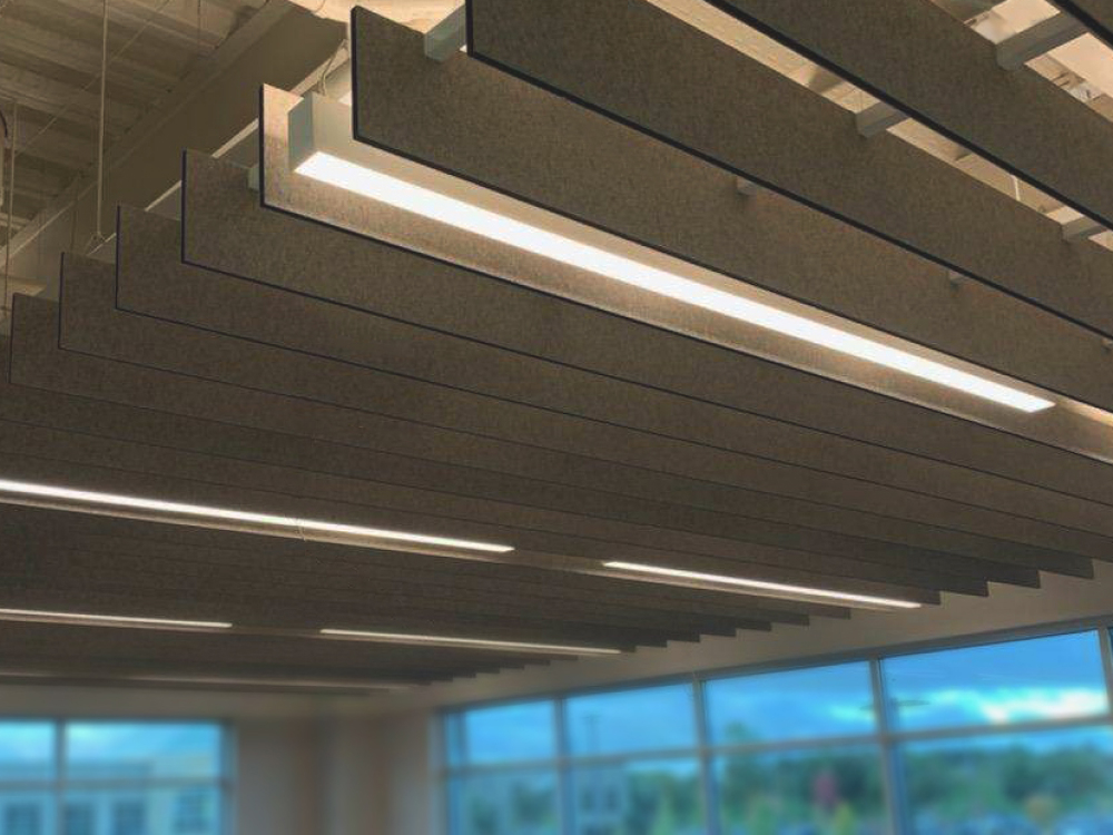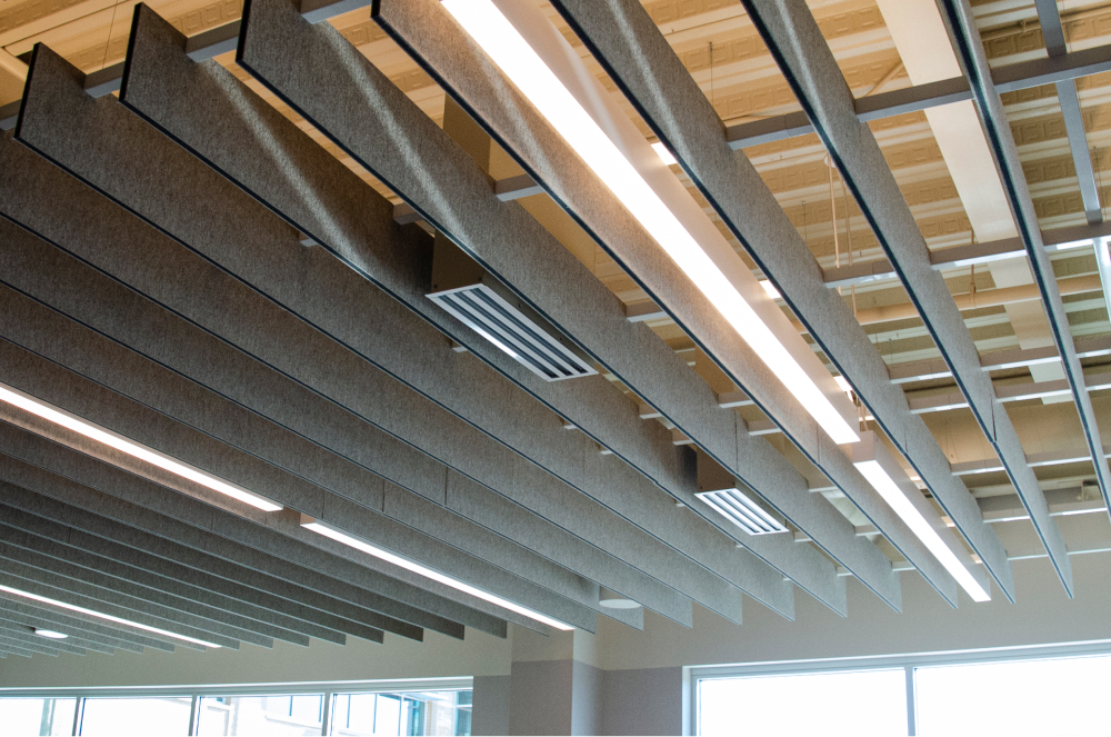 Ceiling baffles dampen sound in Life Time’s Chanhassen HQ
