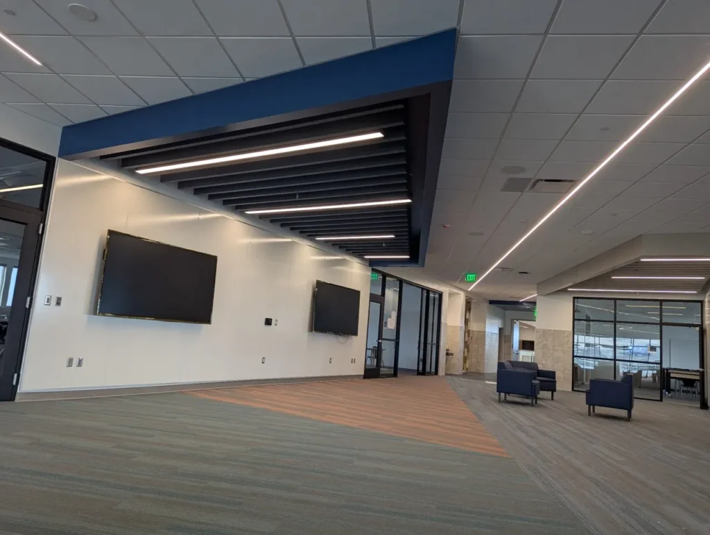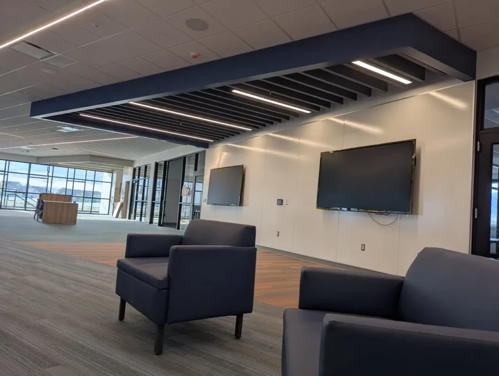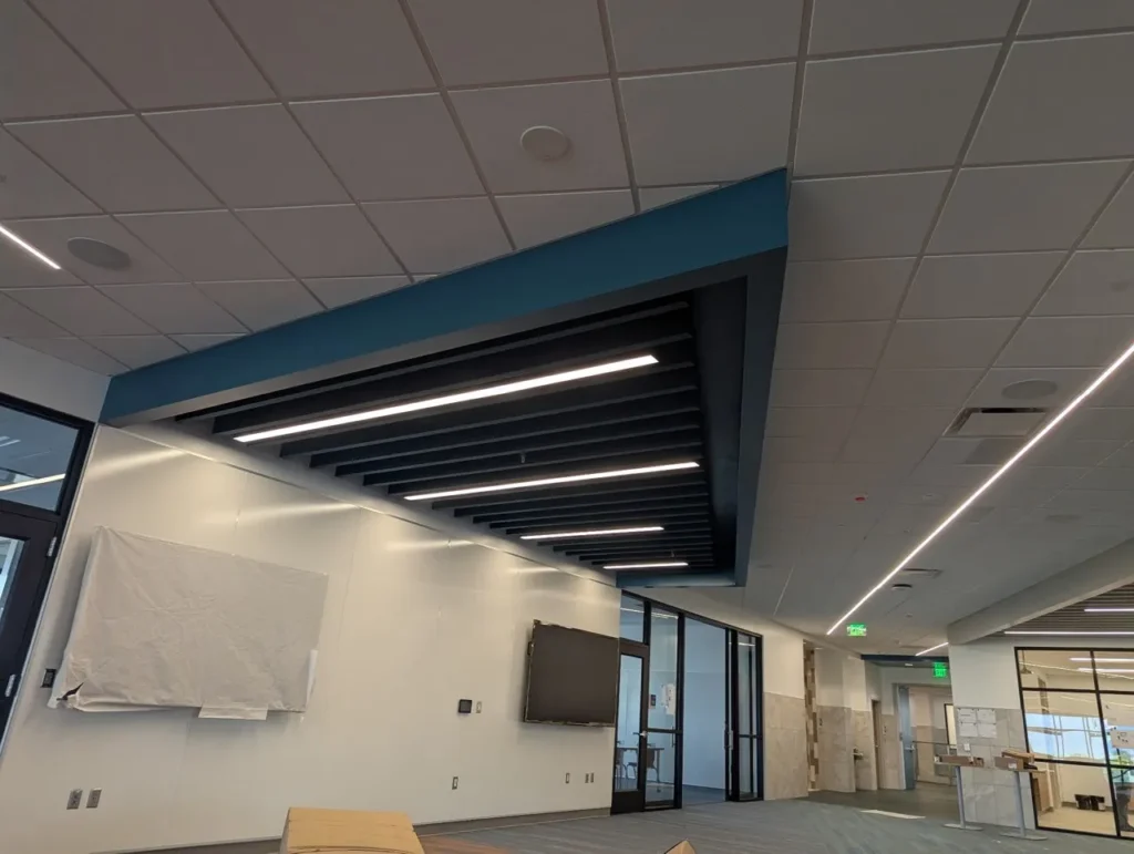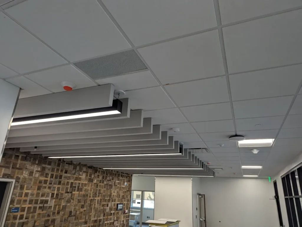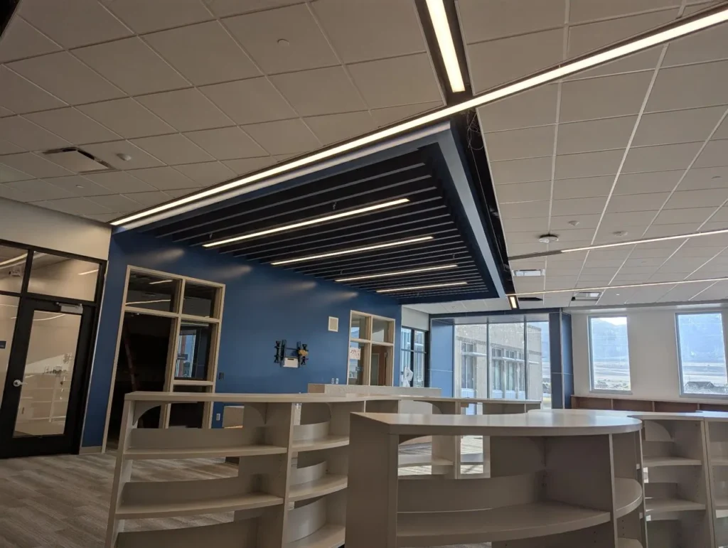Custom acoustic baffles add dynamic color, lighting integration, and sound control throughout Stansbury Junior High School in Utah, enhancing both learning and common areas with a clean, modern aesthetic.