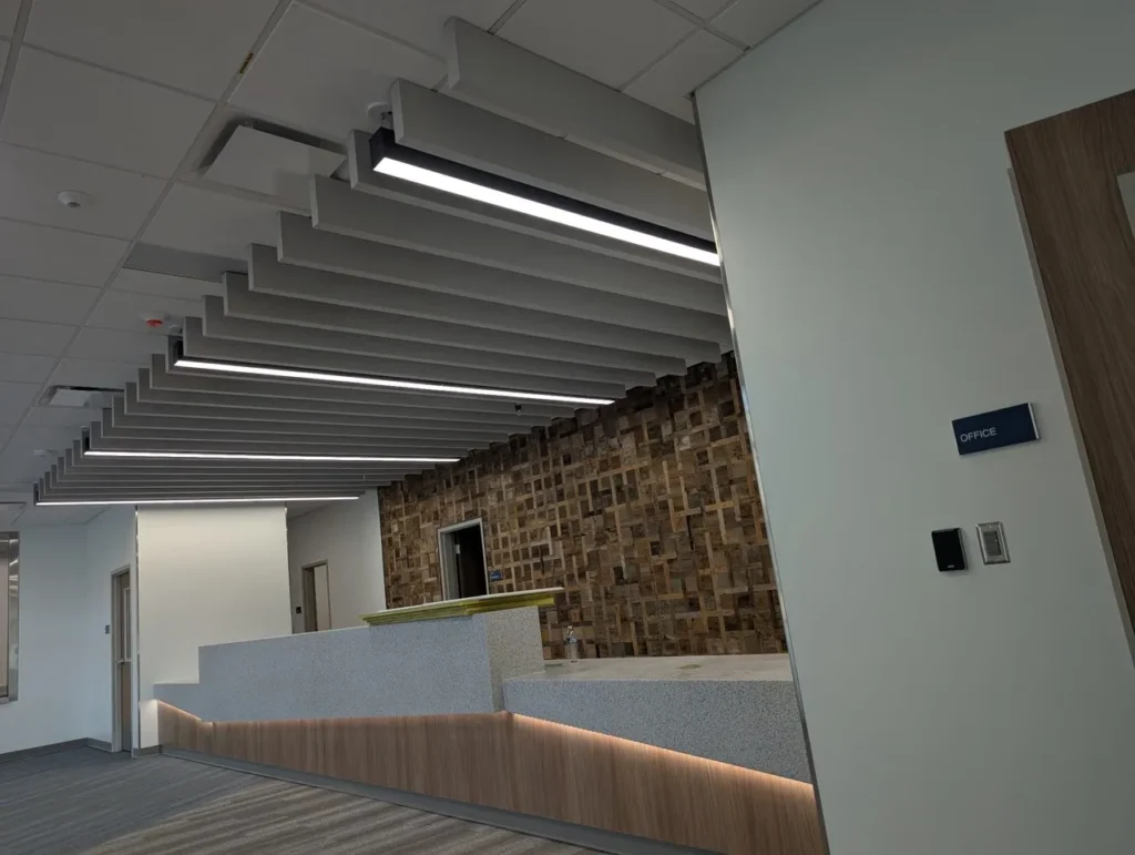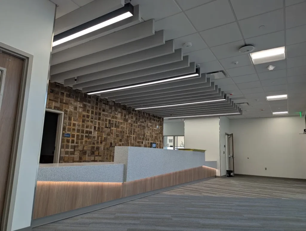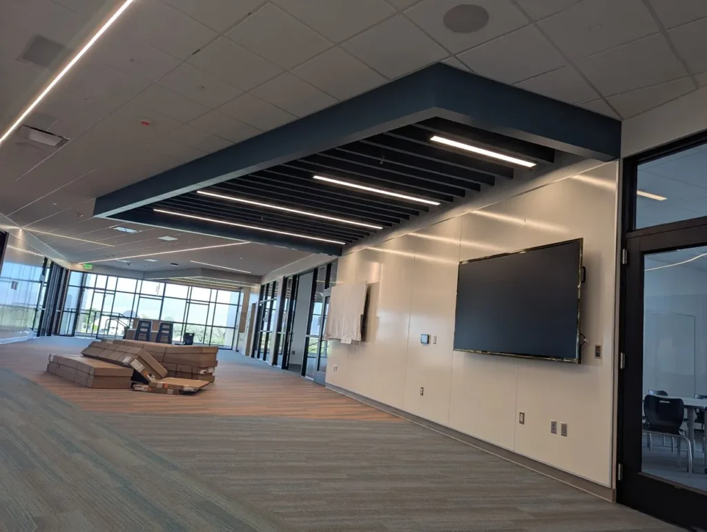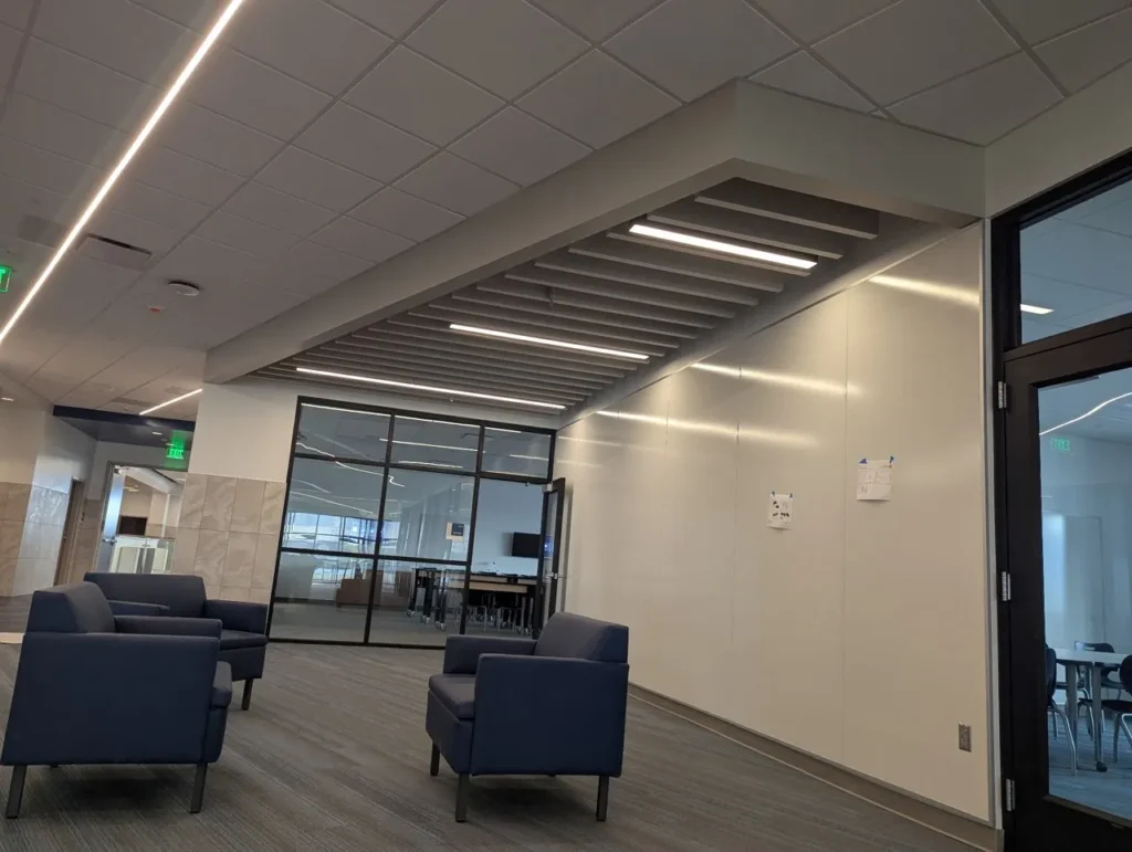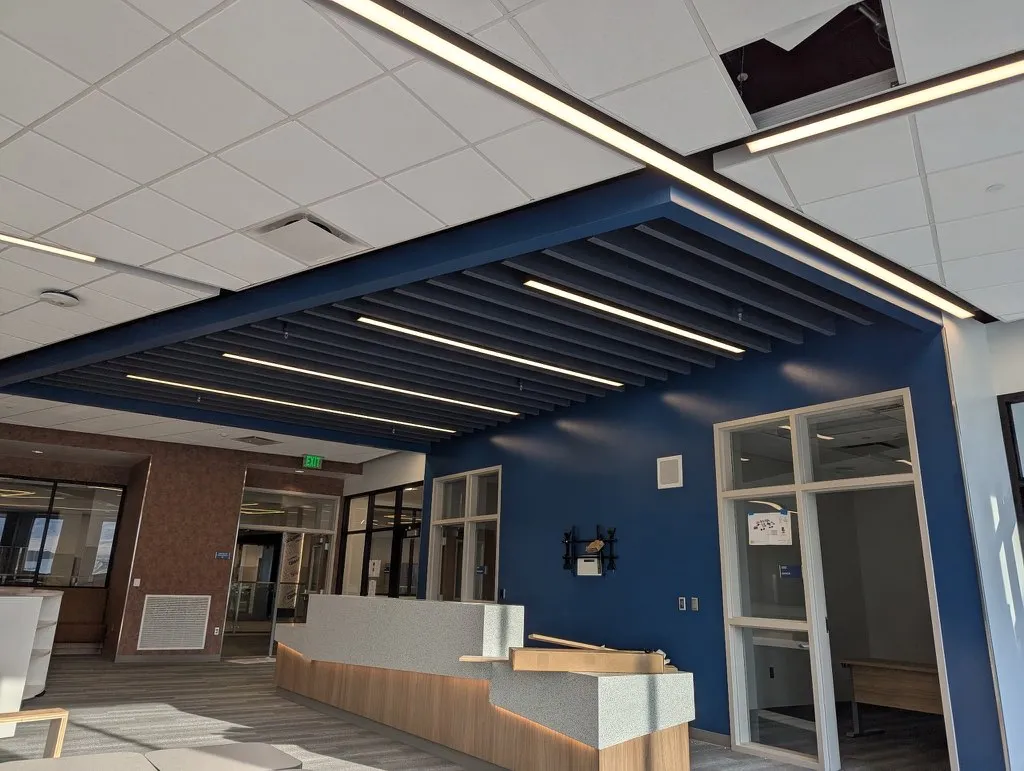 Custom acoustic baffles add dynamic color, lighting integration, and sound control throughout Stansbury Junior High School in Utah, enhancing both learning and common areas with a clean, modern aesthetic.