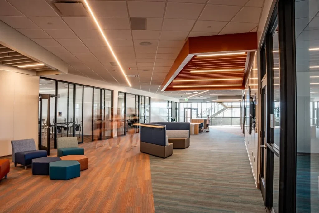 Stansbury Junior High SchoolBy Sanjay Roy / June 25, 2025 Back to Projects Stansbury Junior High School Custom acoustic baffles add dynamic color, lighting integration, and sound control throughout Stansbury Junior High School in Utah, enhancing both learning and common areas with a clean, modern aesthetic. LocationStansbury Park, UtahDesignerMHTN Architects