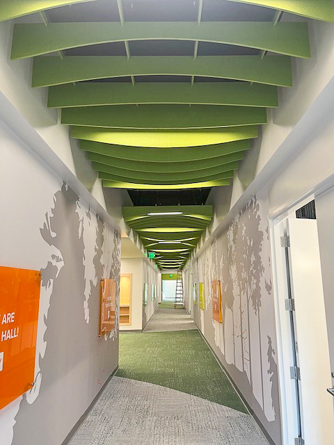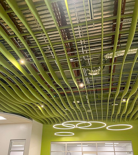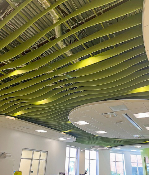 Our Single Baffles were customized in a vibrant green to align with this school’s brand, with a unique arrangement tailored to the architect’s design intent. We adapted the layout to fit the space and accommodate on-site obstacles, like MEP elements and other ceiling features.