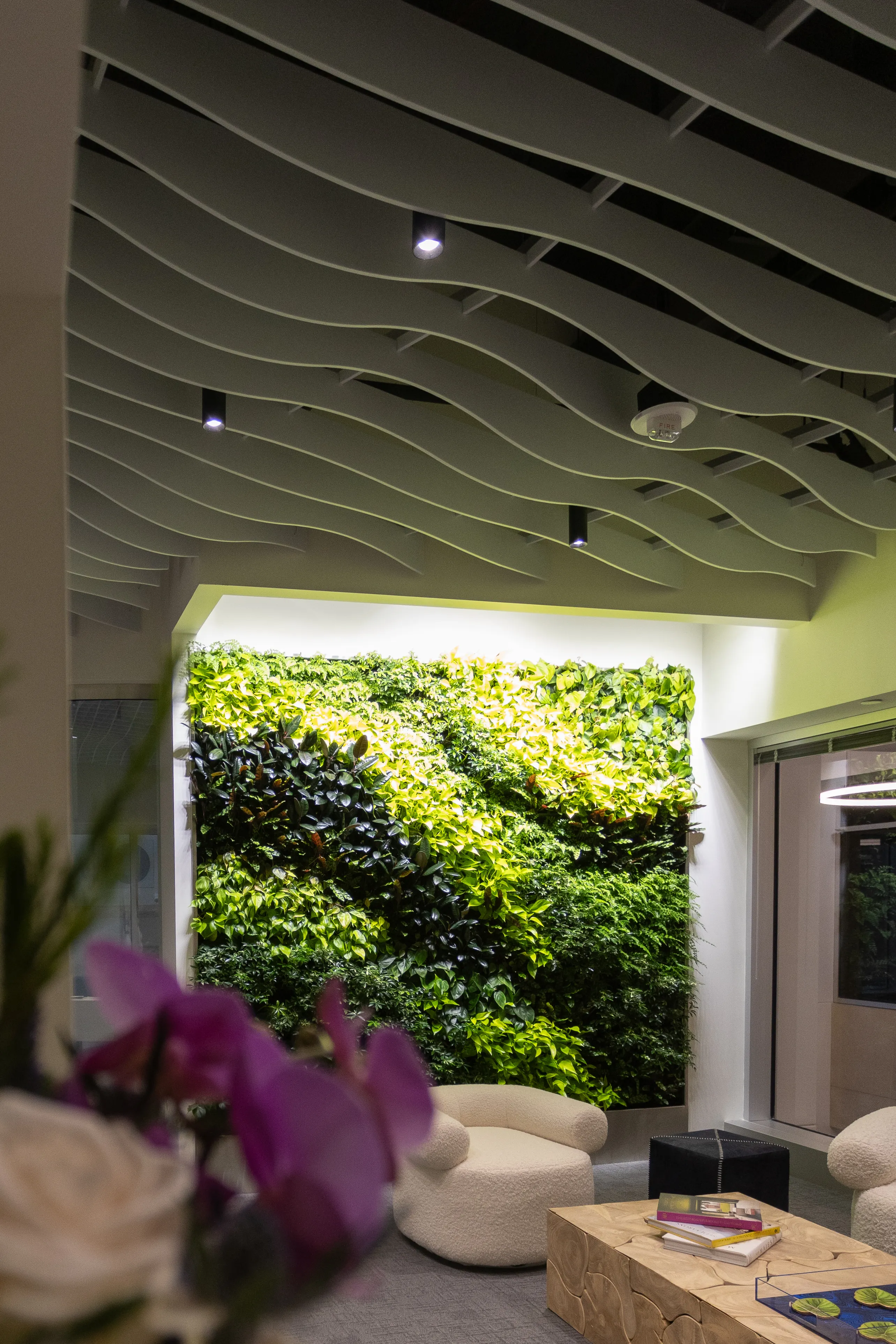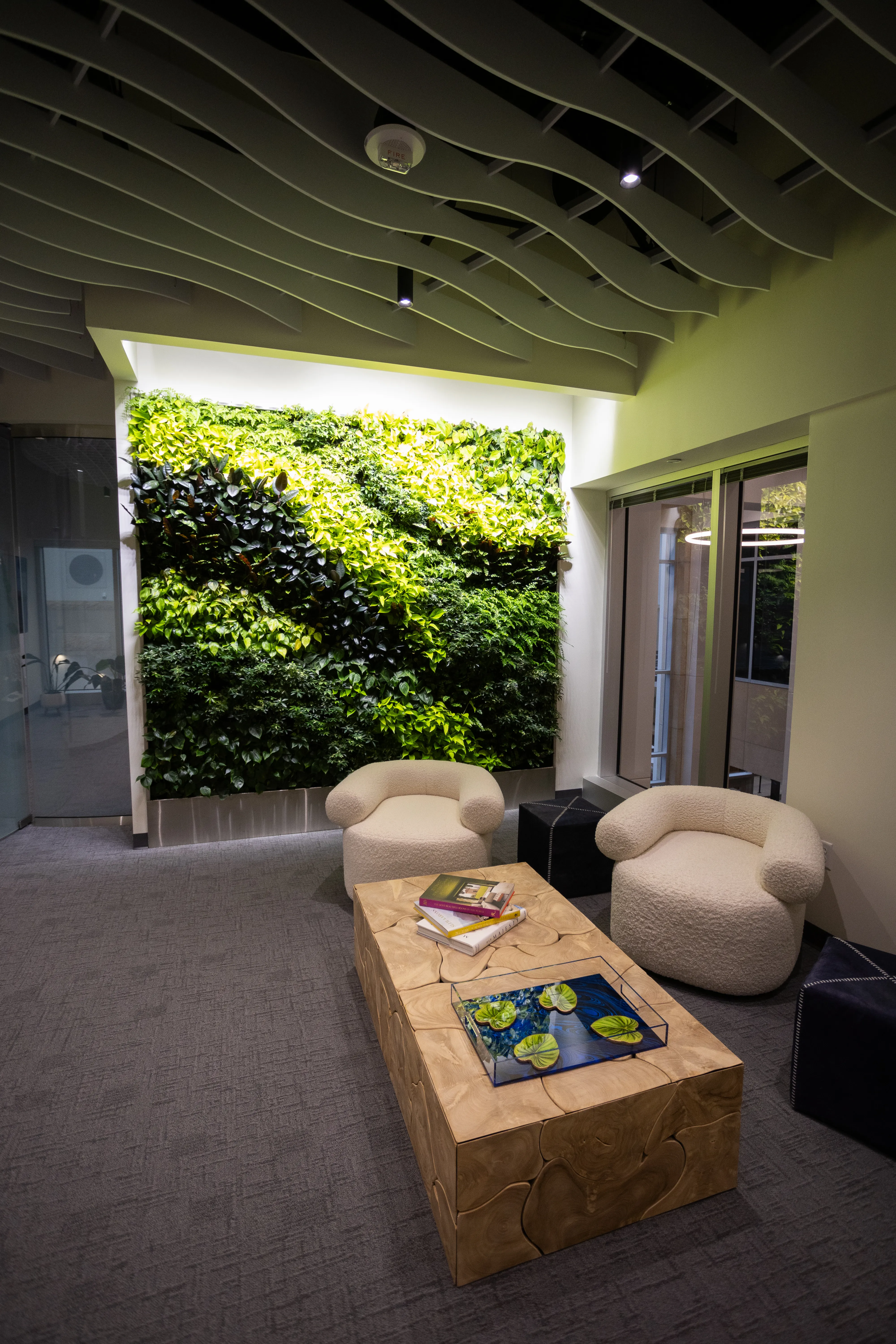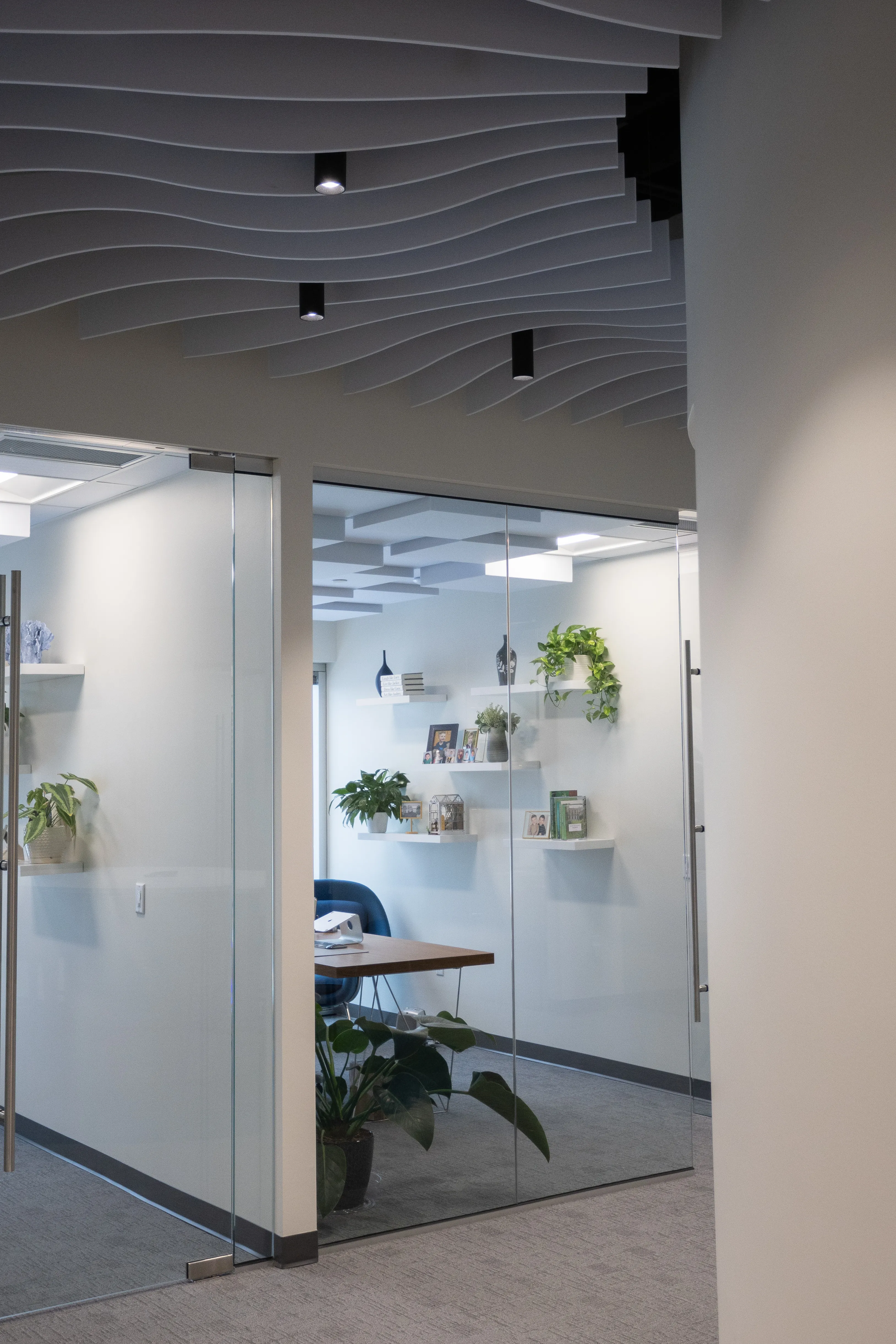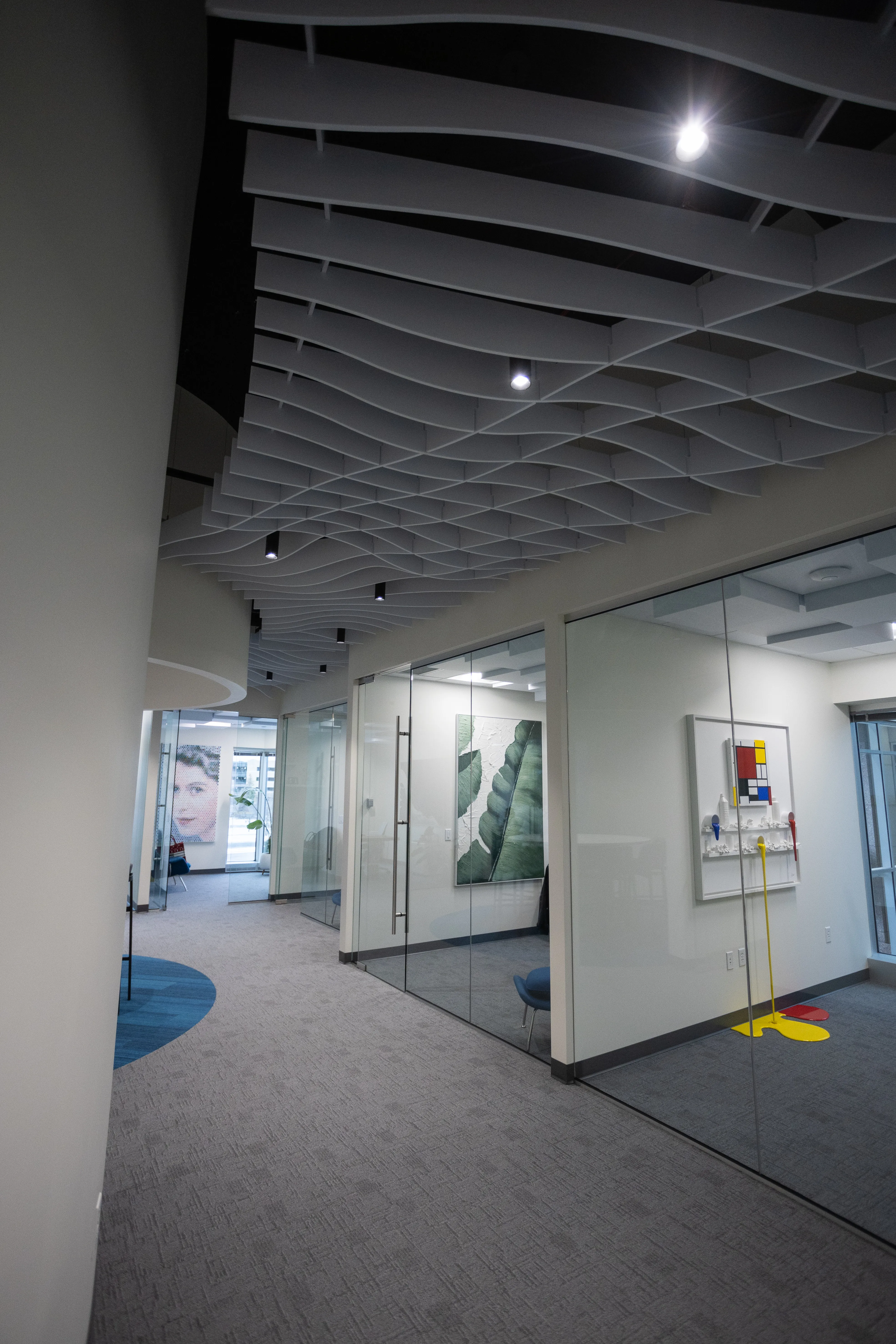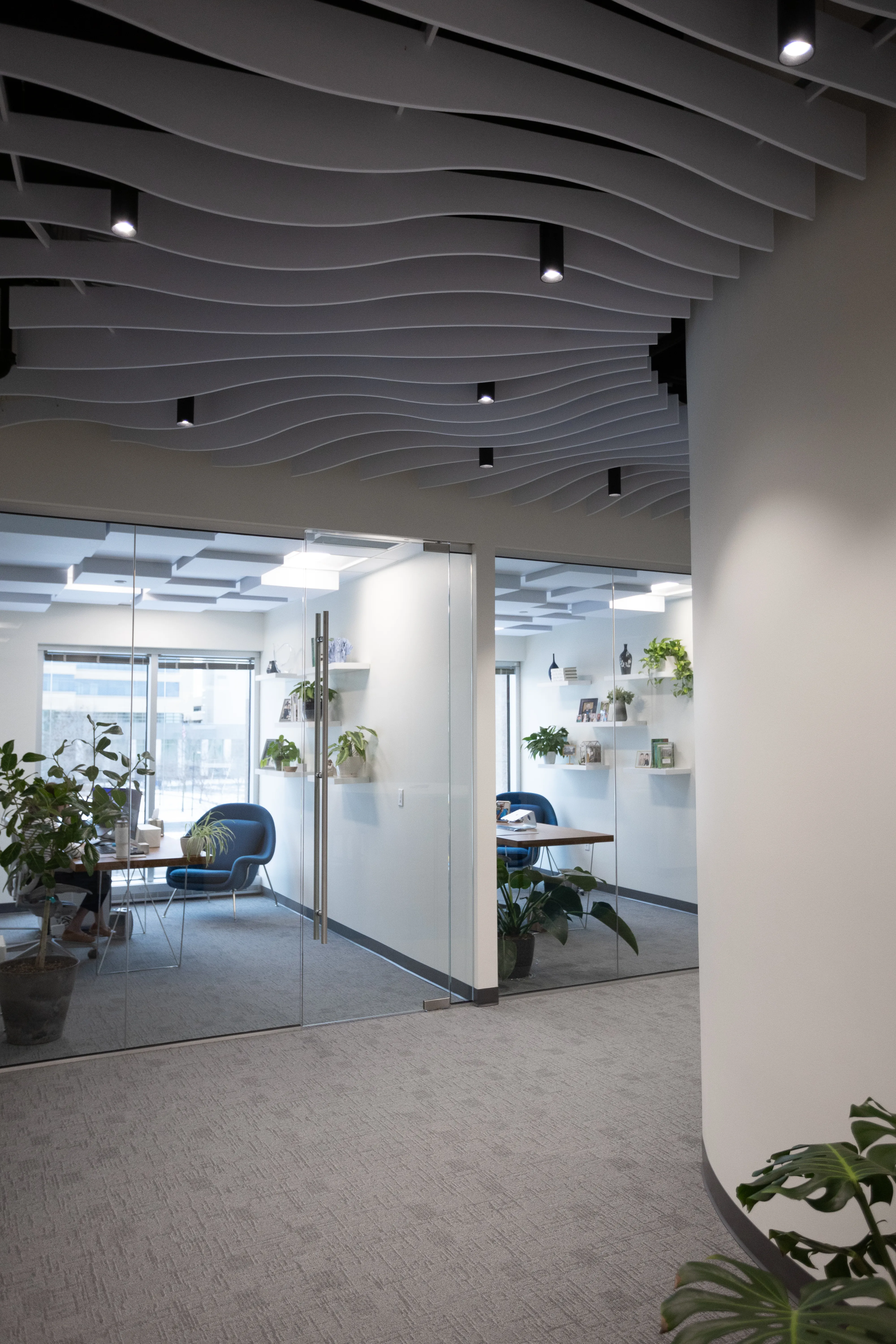 Acoustic baffles, clouds, and ceiling tiles create a seamless blend of sound absorption and architectural elegance at White Oaks Financial’s office at The Colonnade in Minneapolis, complemented by Bird of Paradise plants and a living green wall by our sister brand Plantscape Live for added biophilic impact.