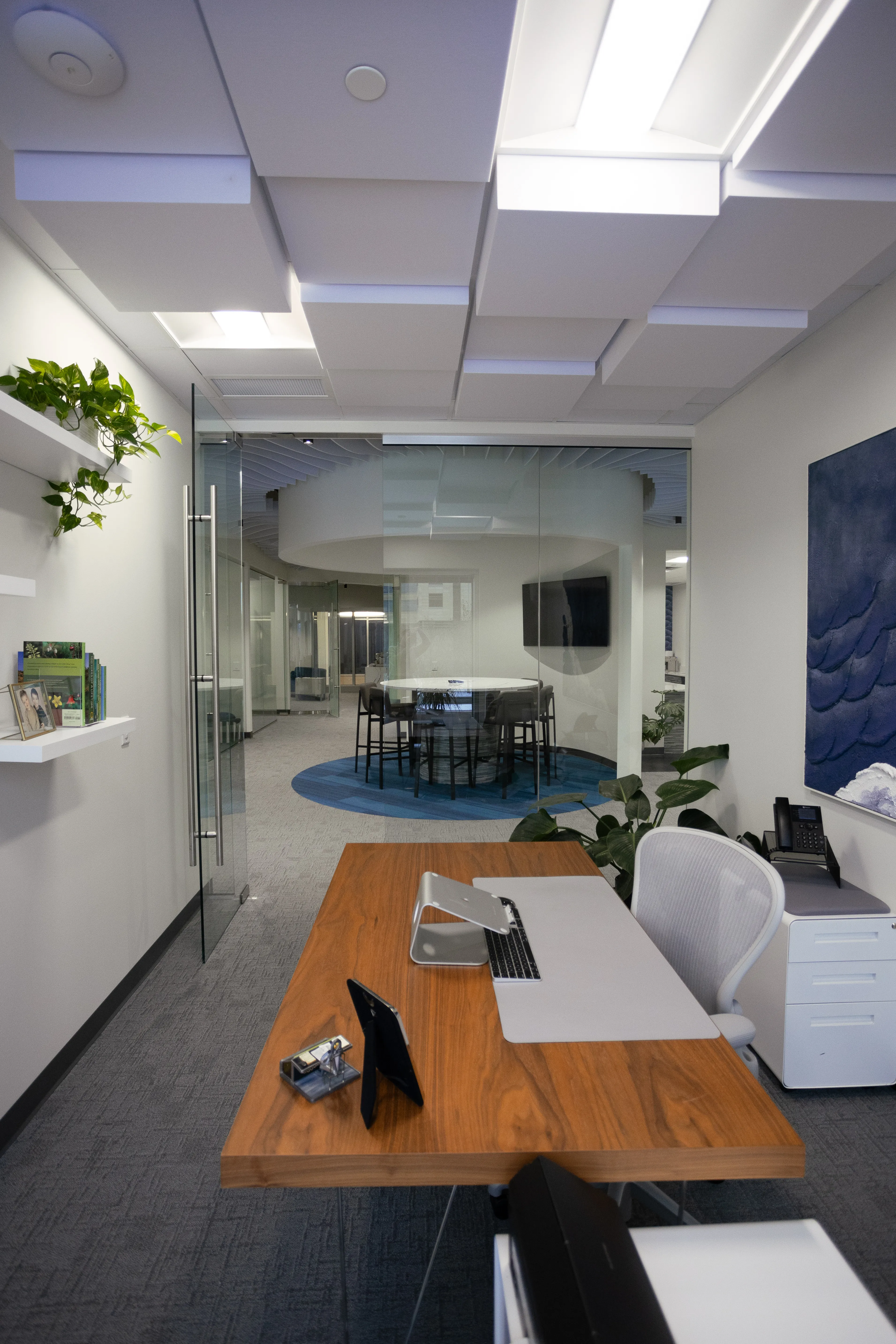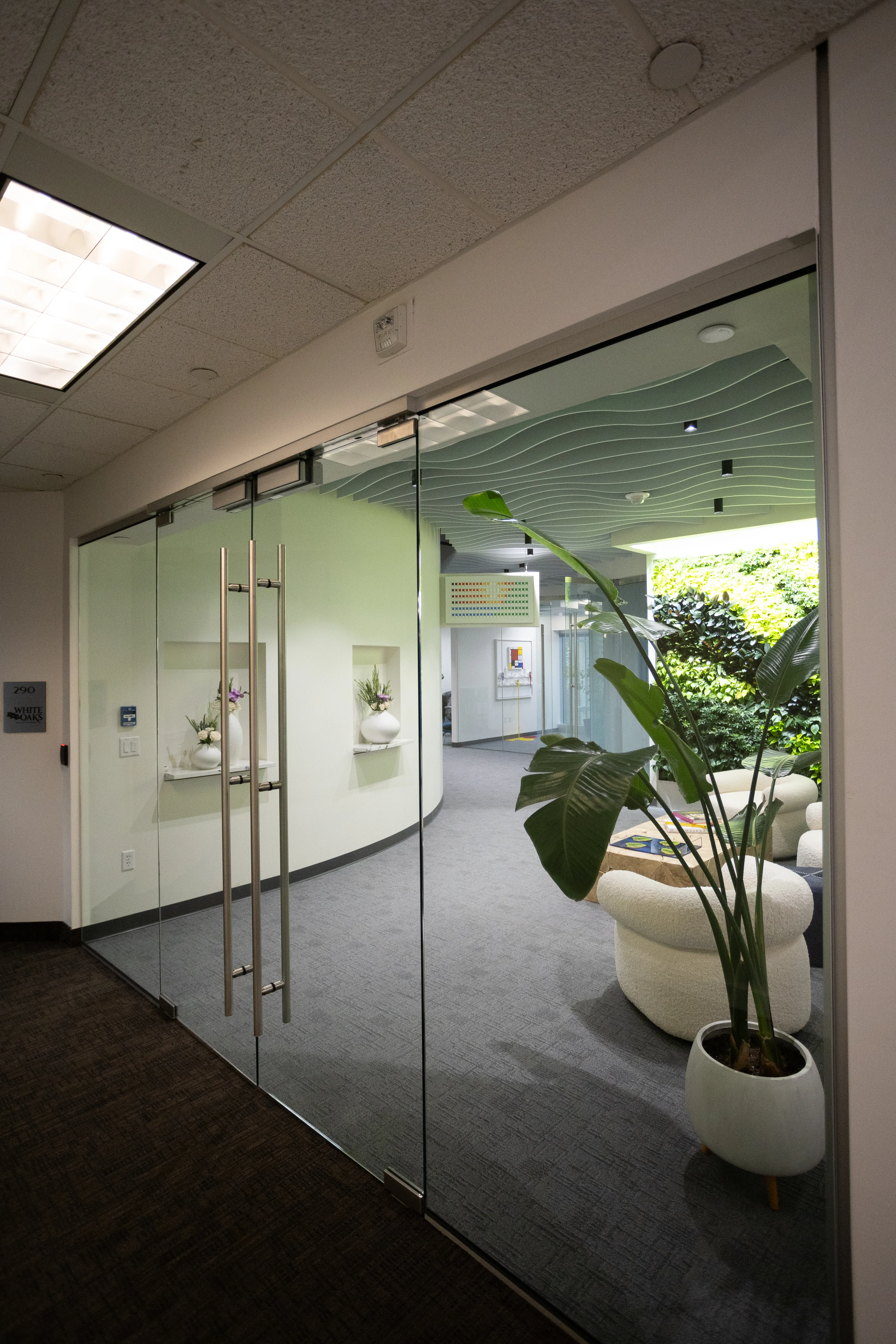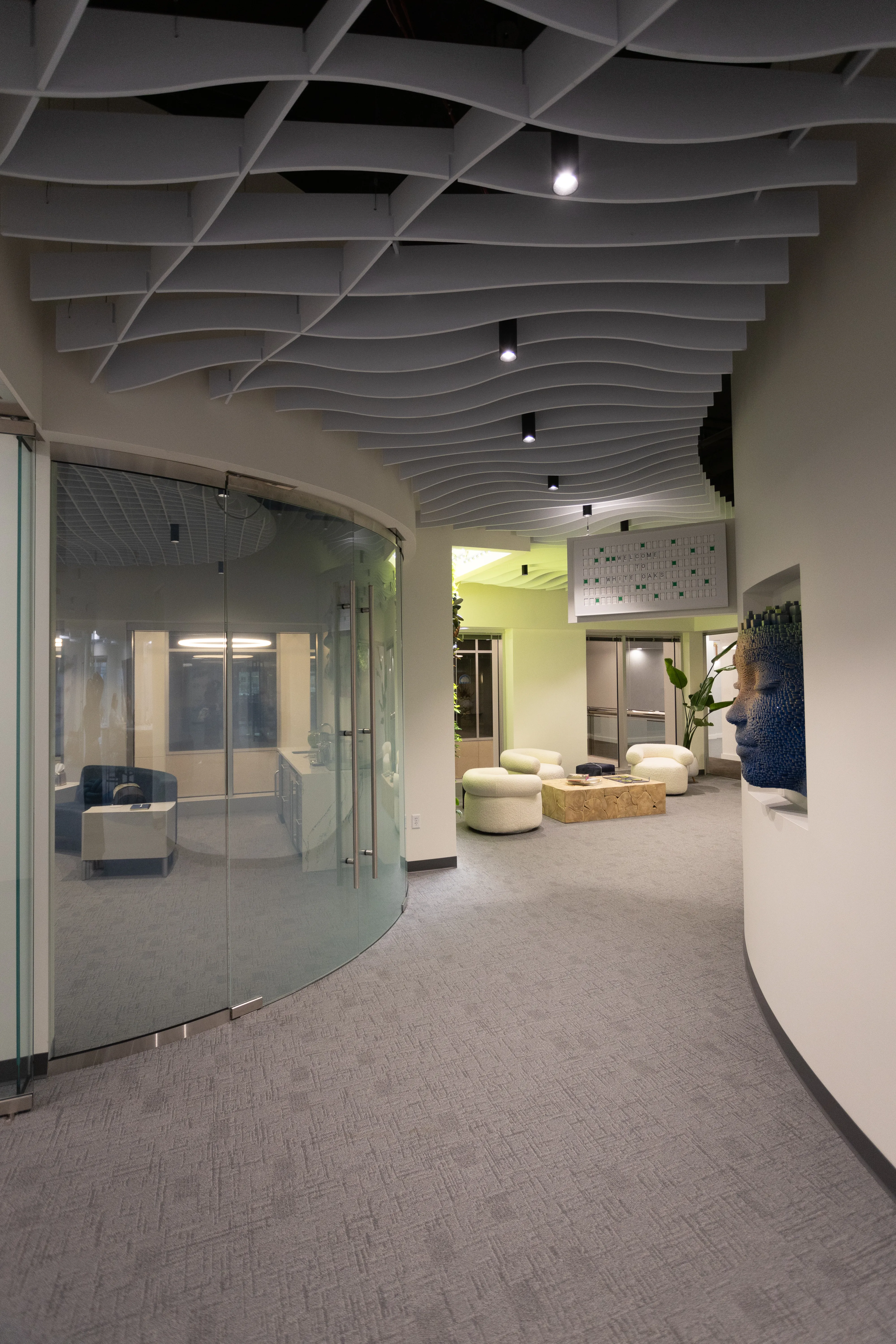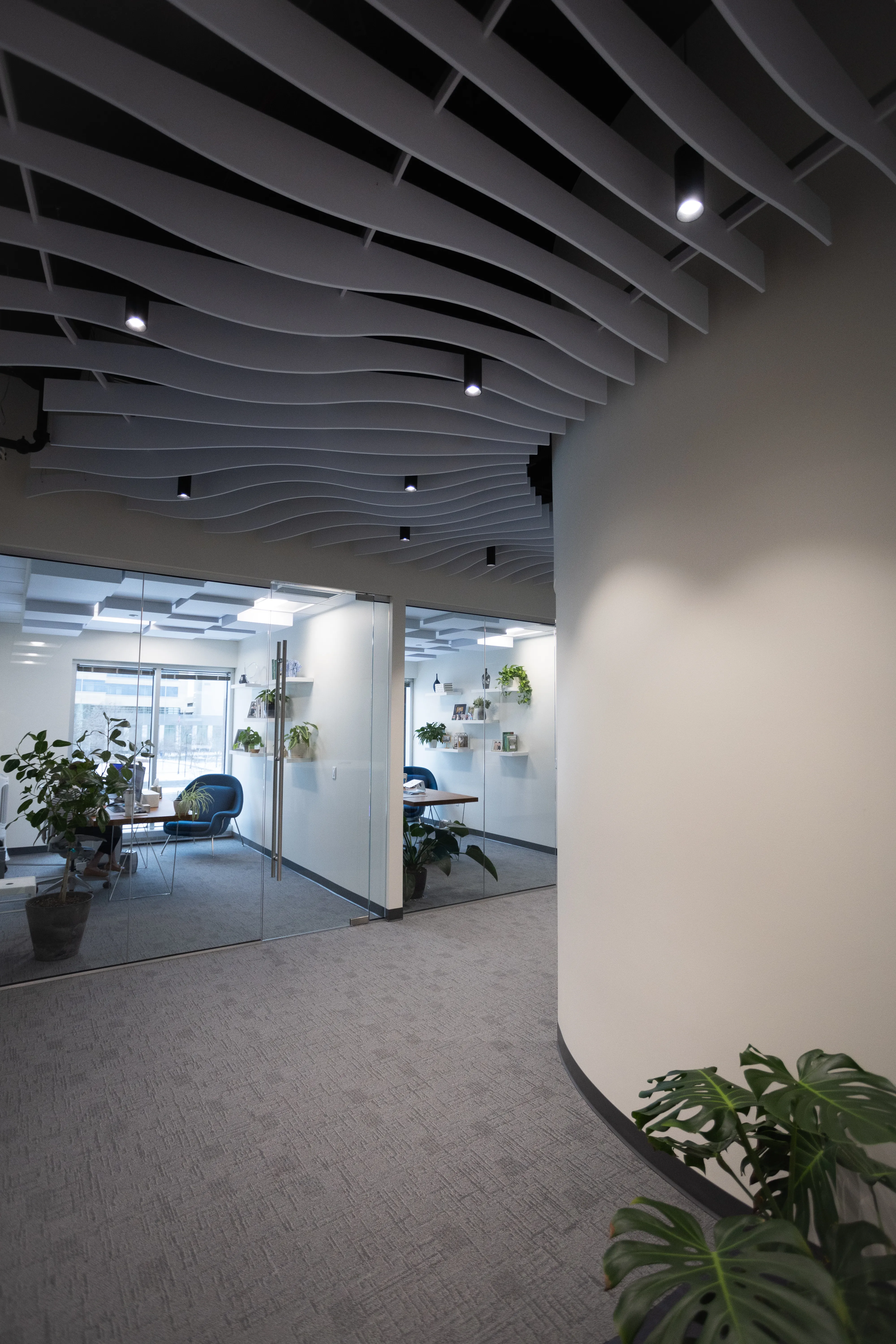 Acoustic baffles, clouds, and ceiling tiles create a seamless blend of sound absorption and architectural elegance at White Oaks Financial’s office at The Colonnade in Minneapolis, complemented by Bird of Paradise plants and a living green wall by our sister brand Plantscape Live for added biophilic impact.