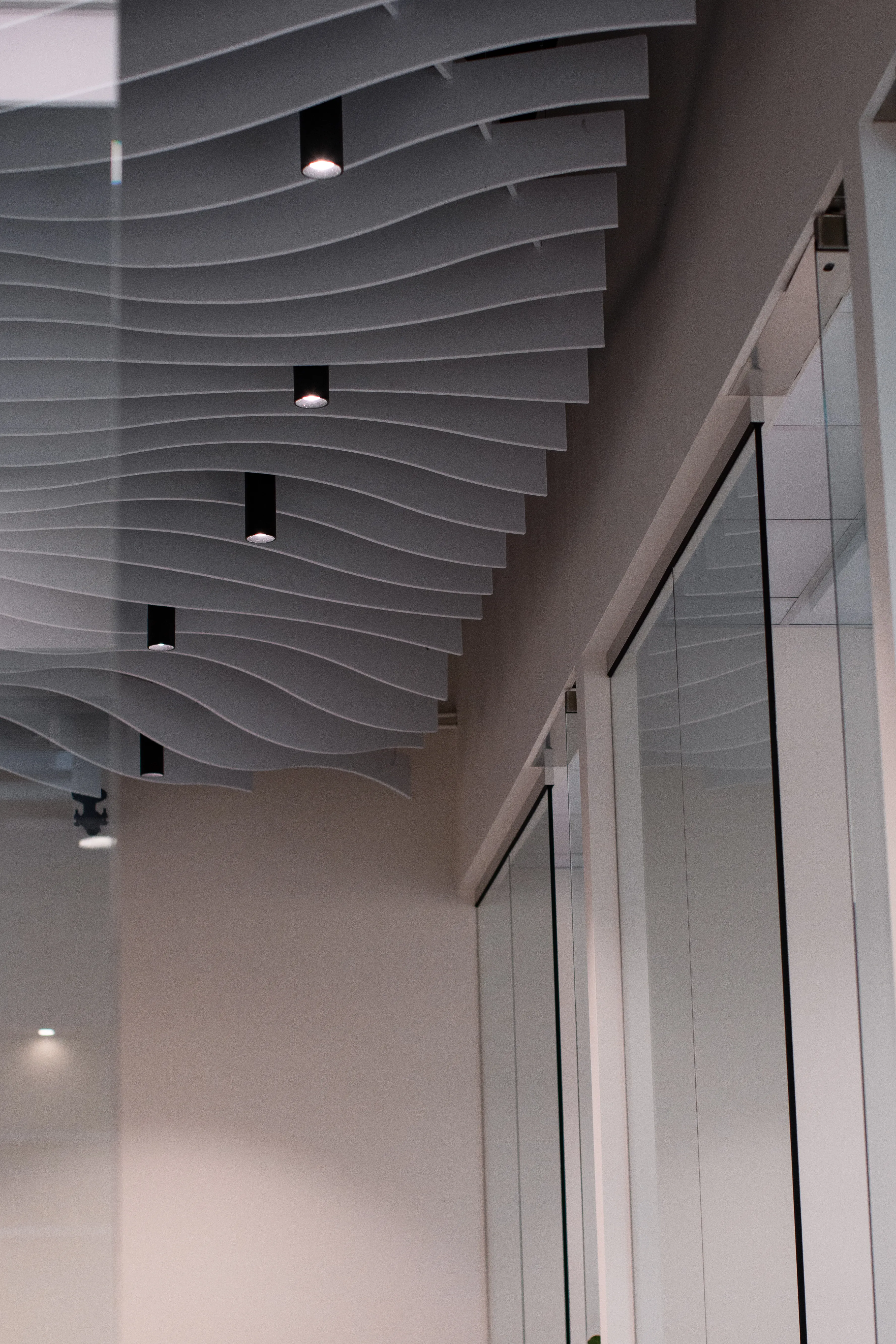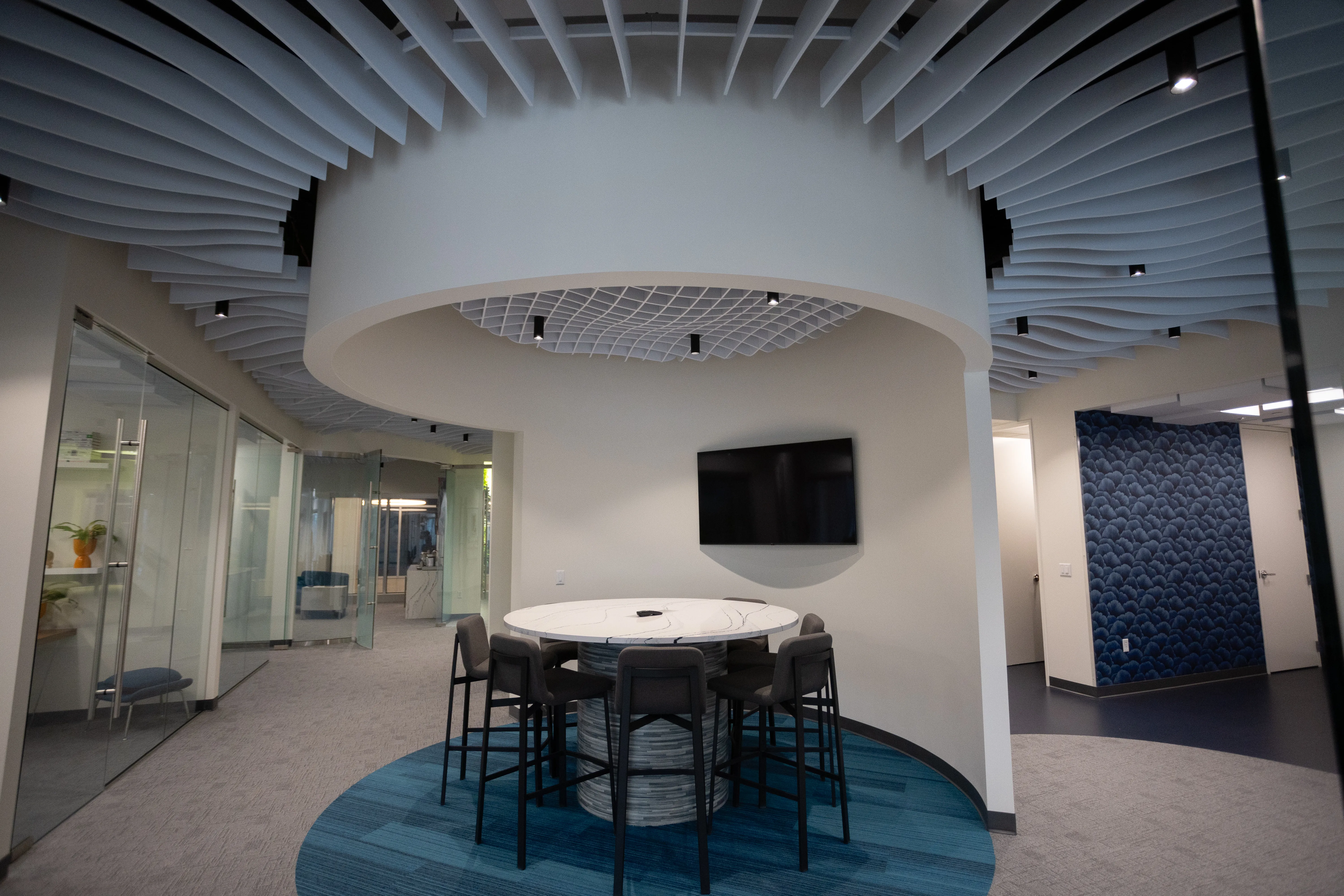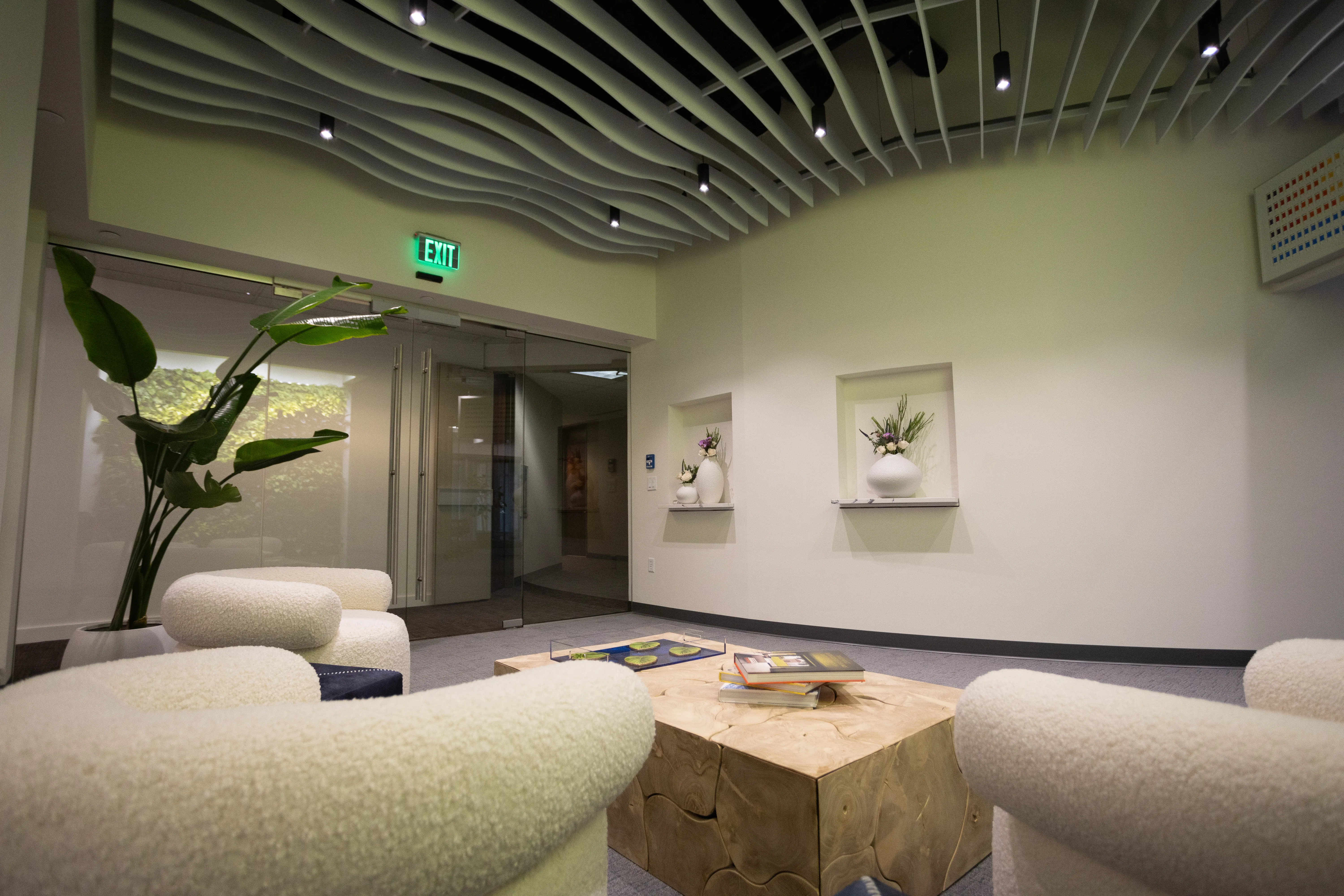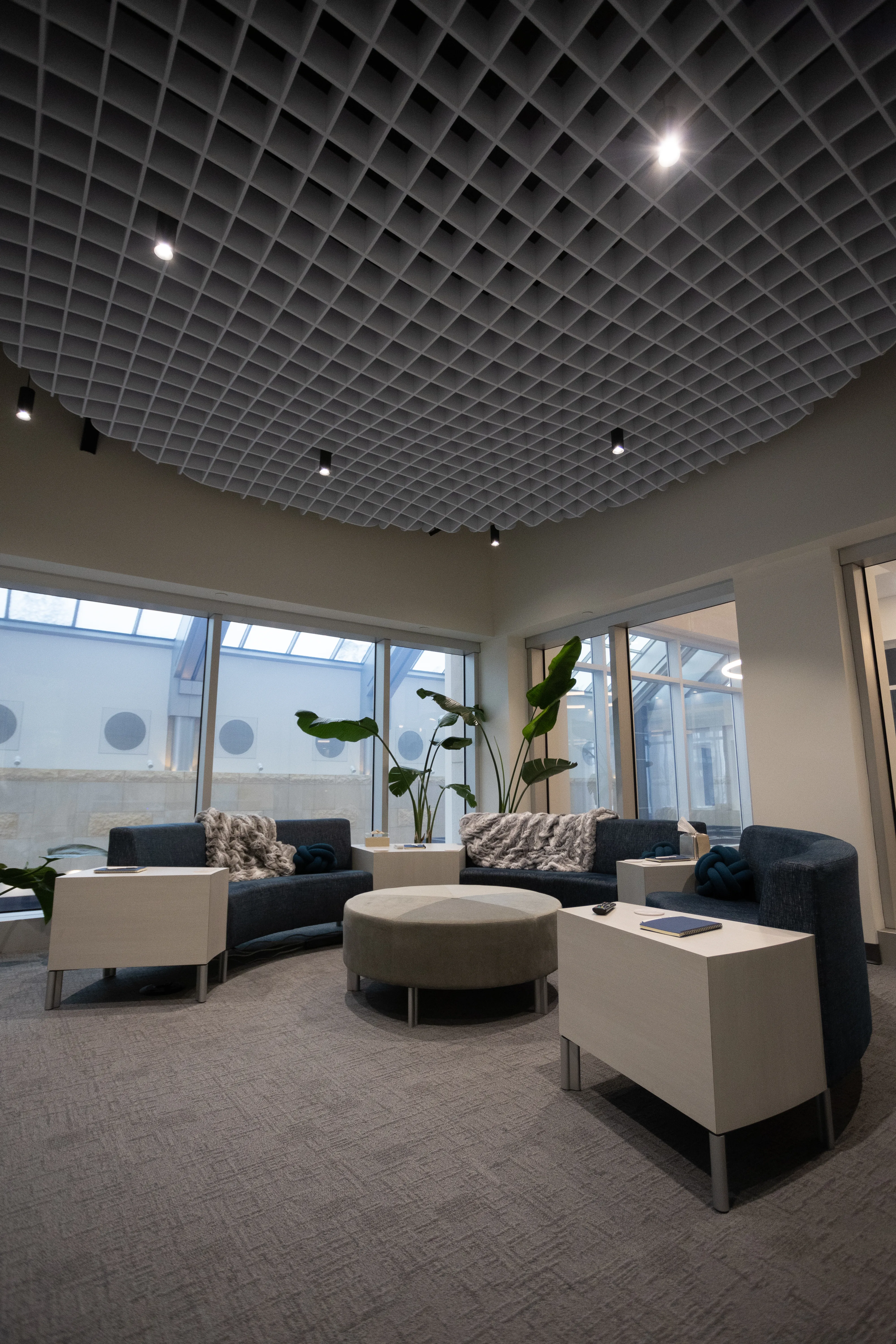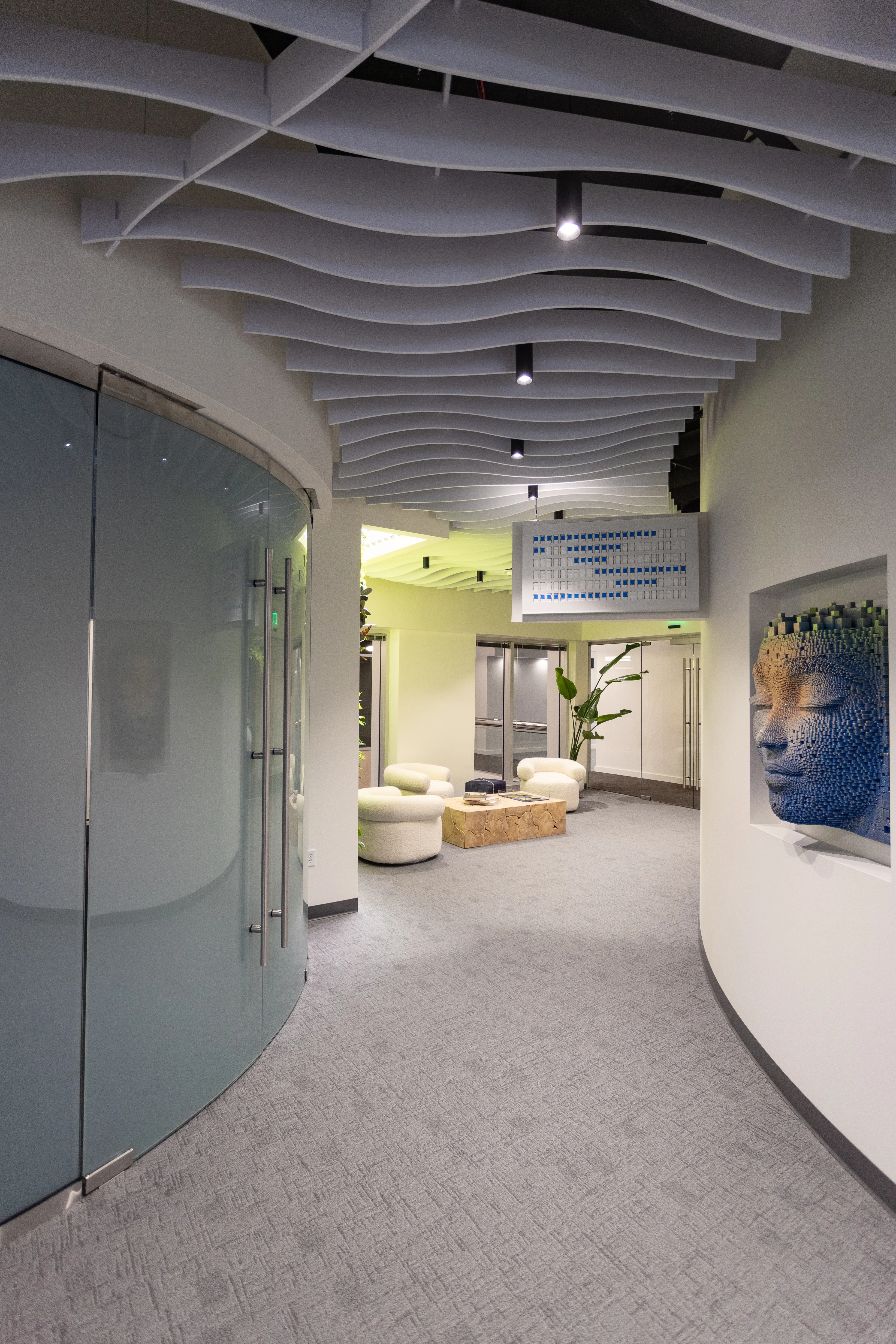 Acoustic baffles, clouds, and ceiling tiles create a seamless blend of sound absorption and architectural elegance at White Oaks Financial’s office at The Colonnade in Minneapolis, complemented by Bird of Paradise plants and a living green wall by our sister brand Plantscape Live for added biophilic impact.