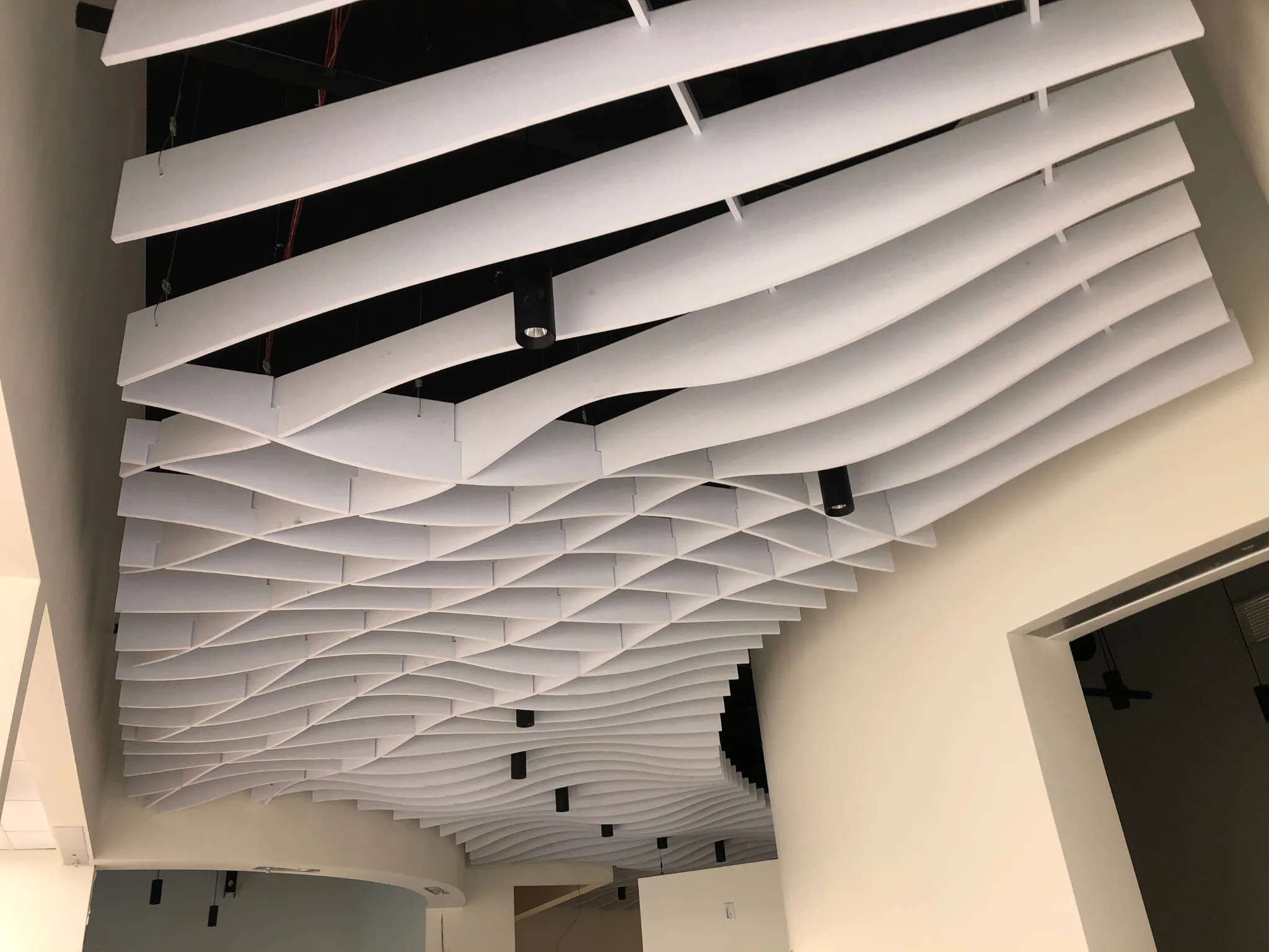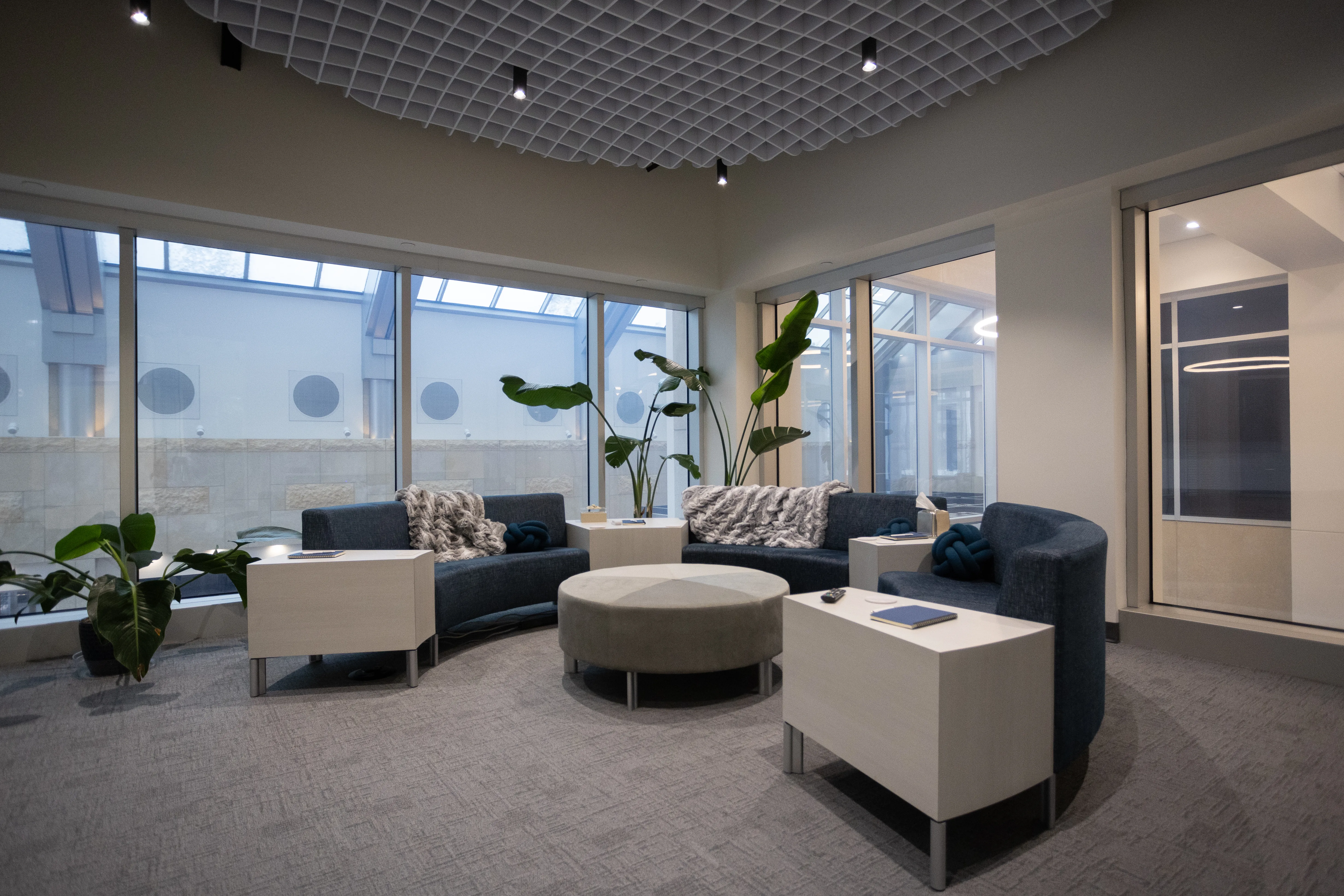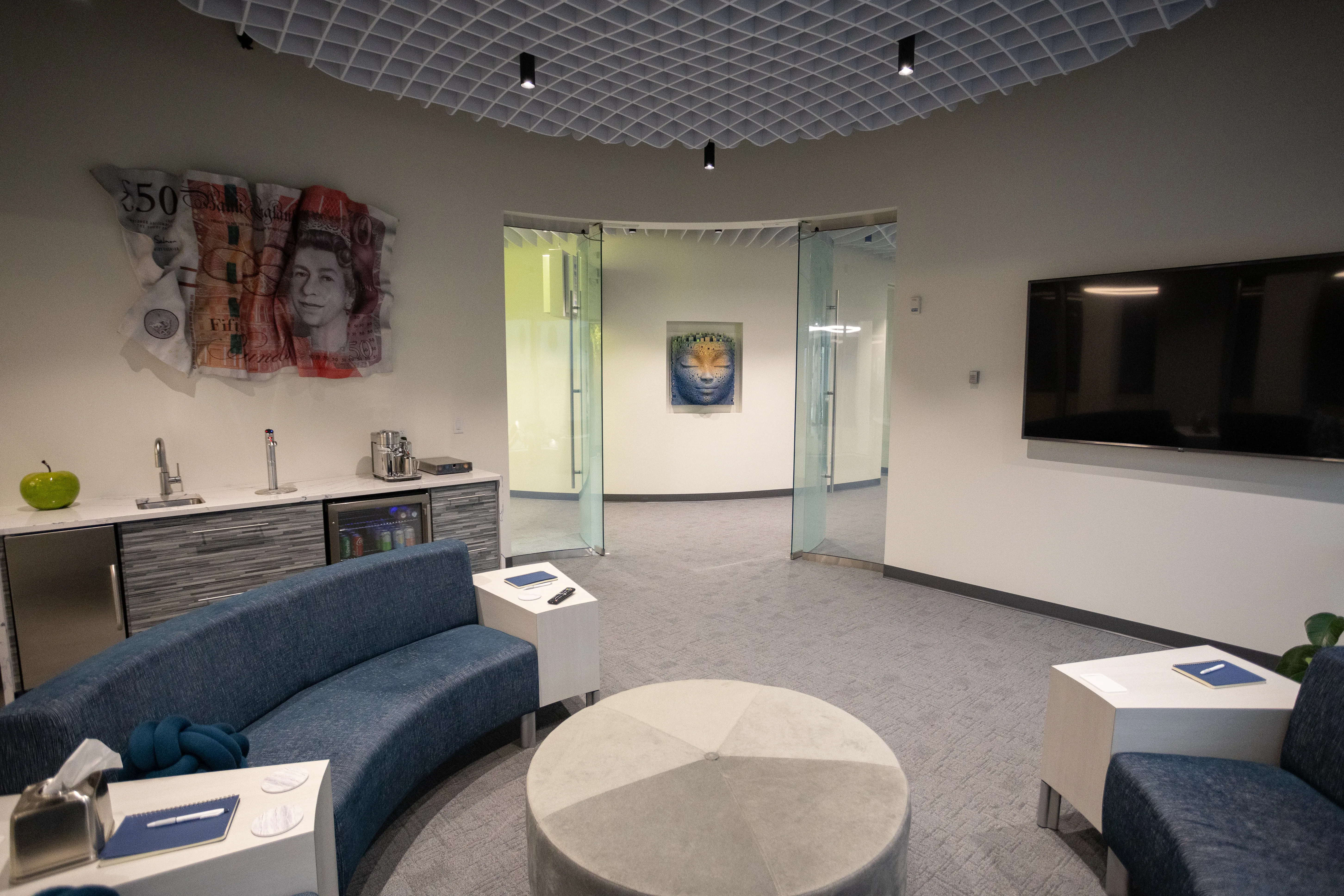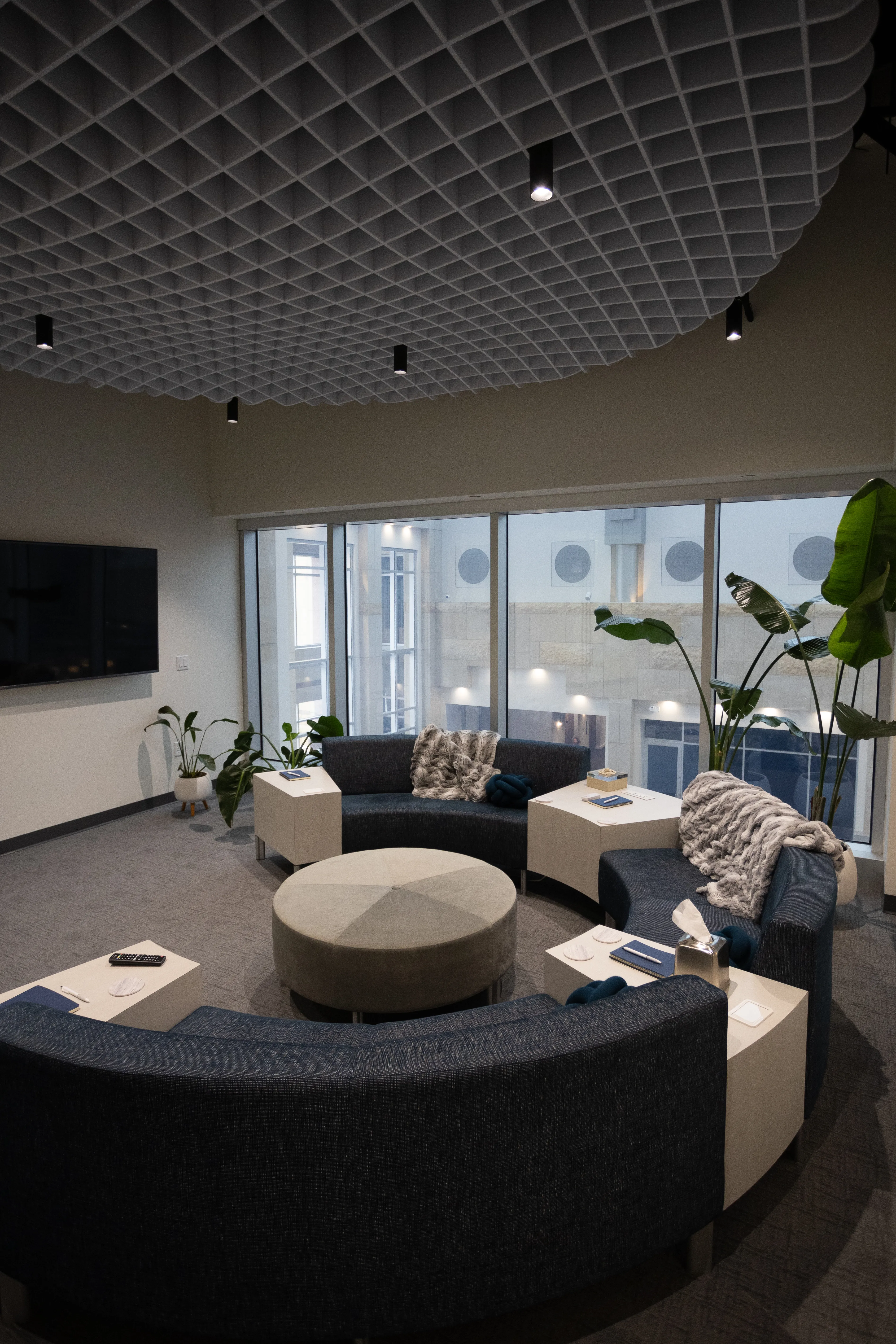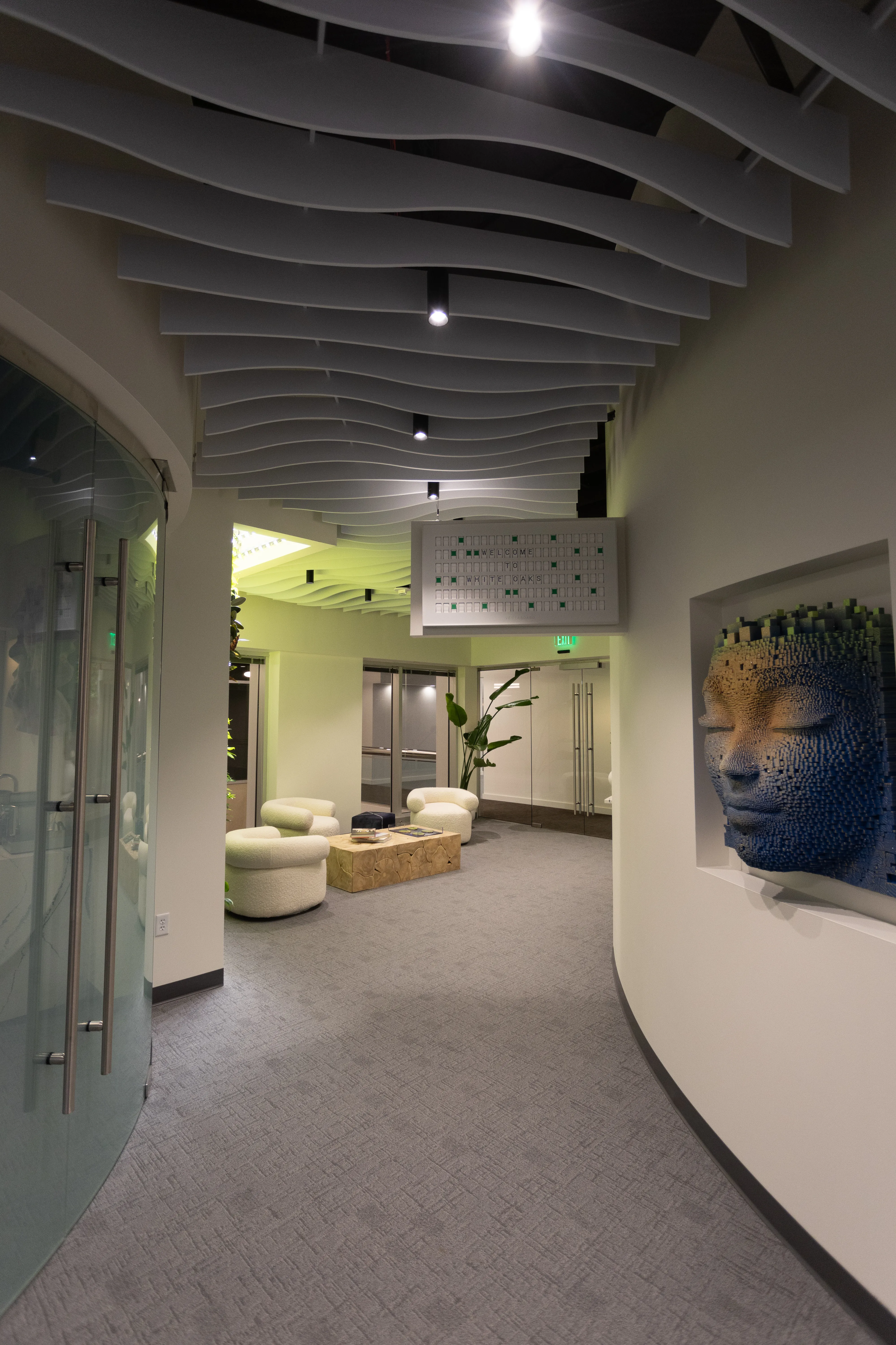 Acoustic baffles, clouds, and ceiling tiles create a seamless blend of sound absorption and architectural elegance at White Oaks Financial’s office at The Colonnade in Minneapolis, complemented by Bird of Paradise plants and a living green wall by our sister brand Plantscape Live for added biophilic impact.
